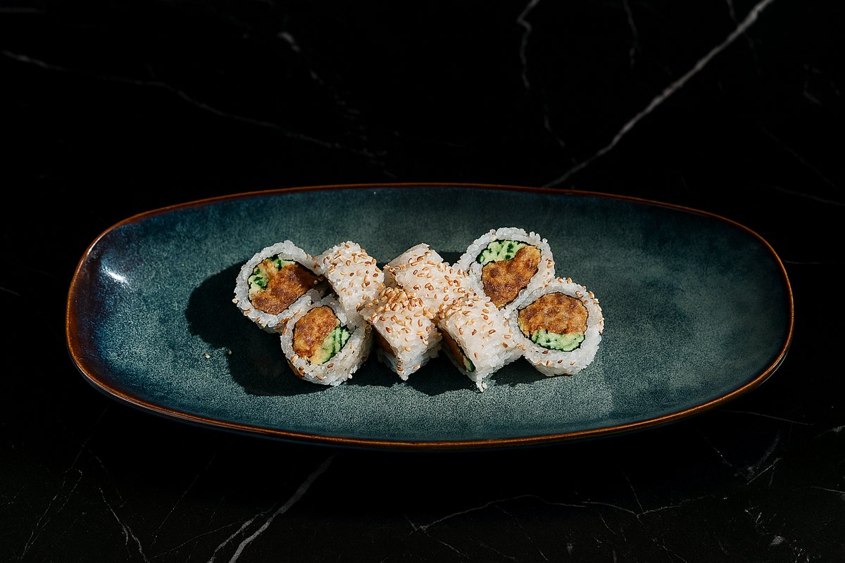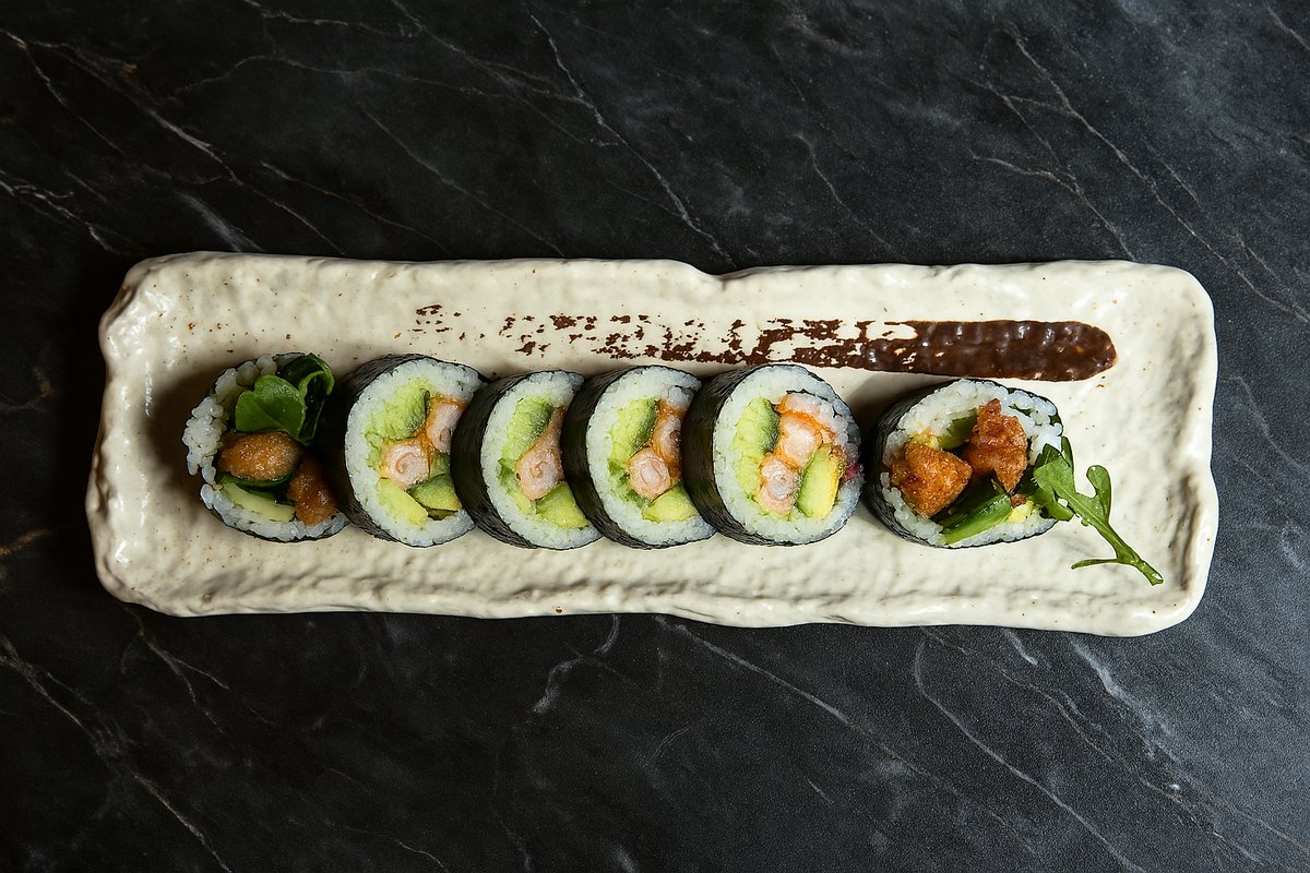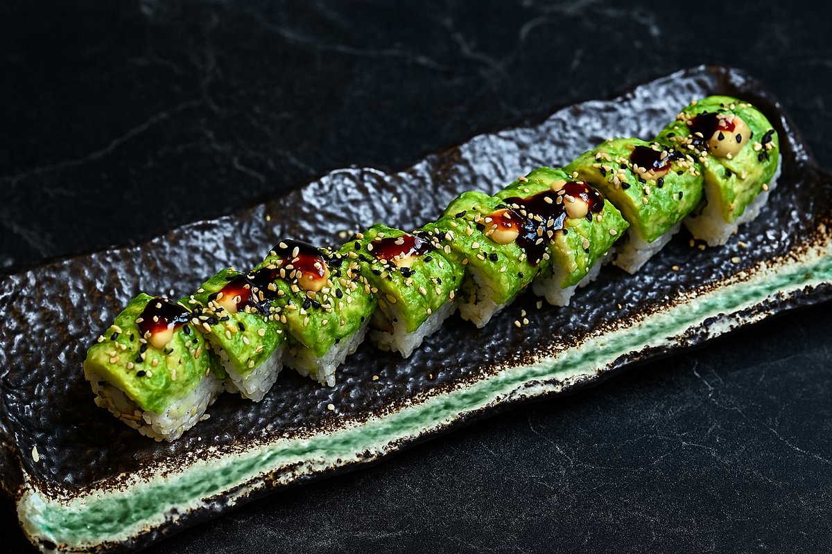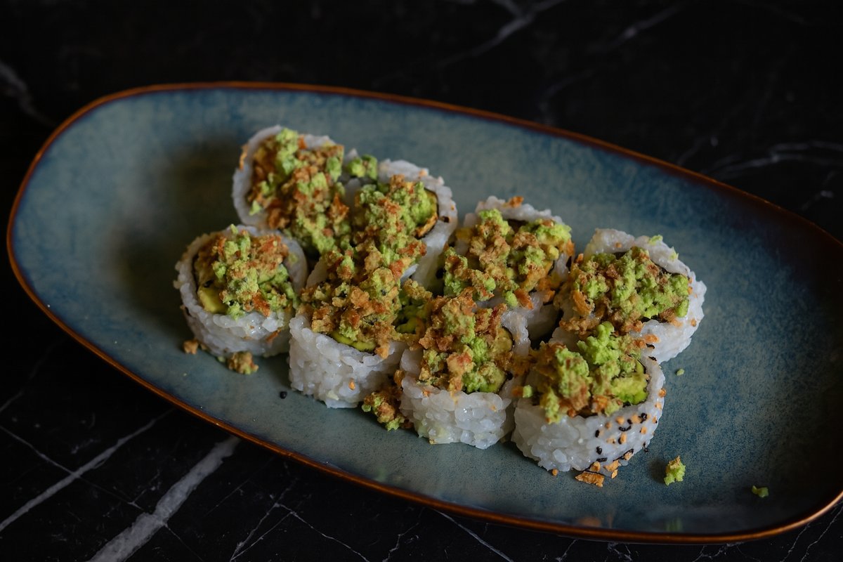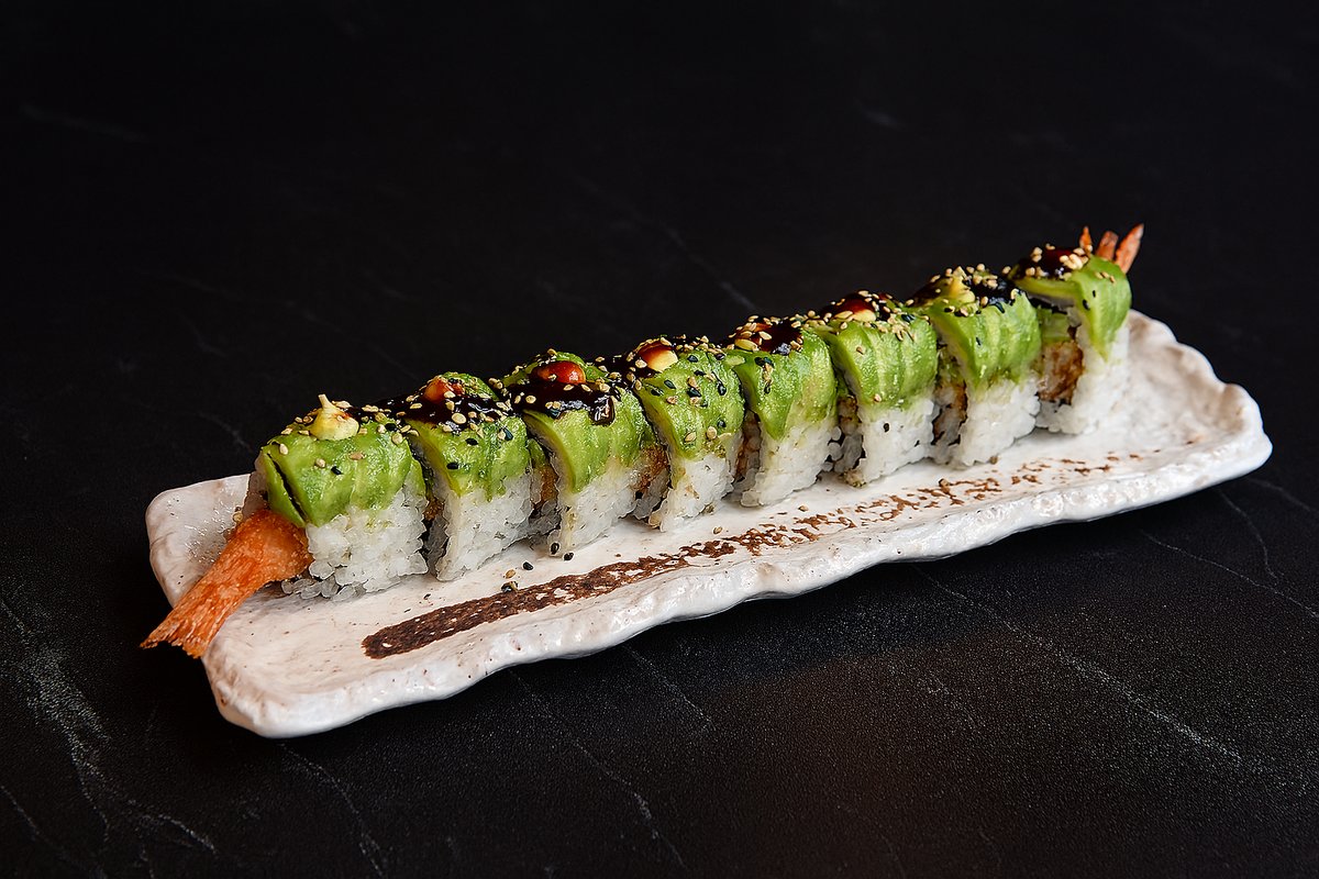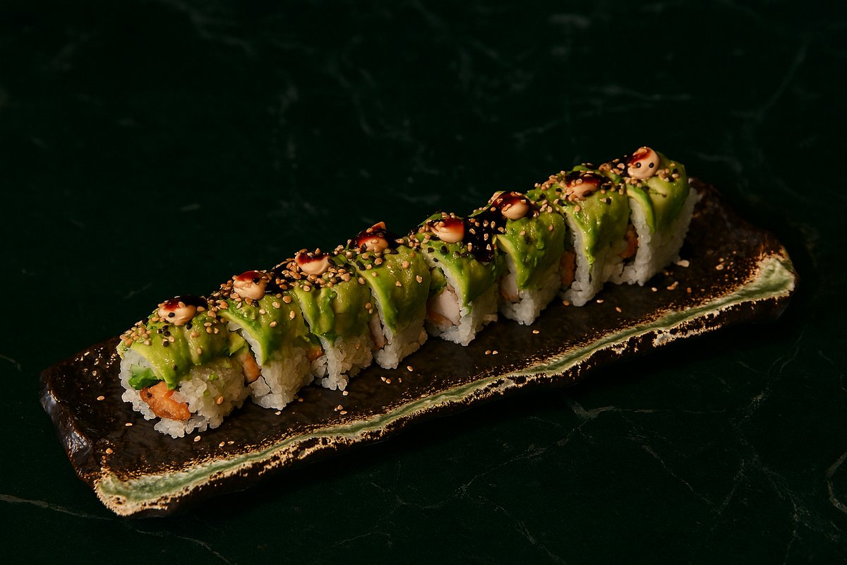Tempurarejer og avocado, toppet med avocado, chilimayo, teriyaki og sesam.