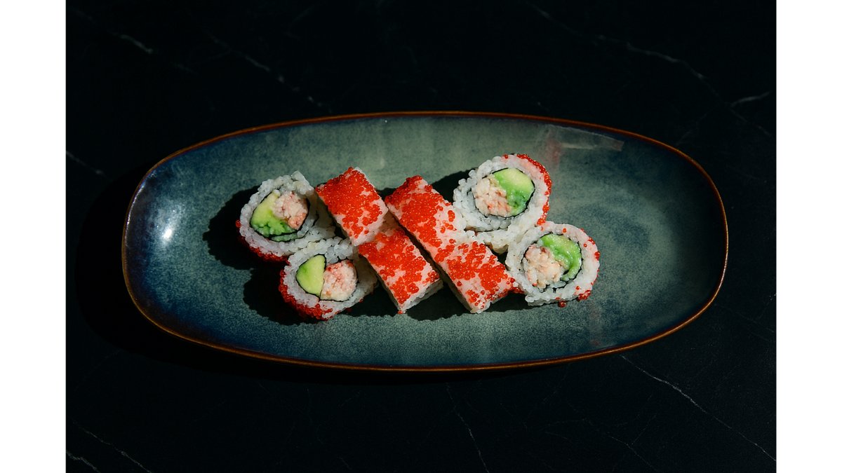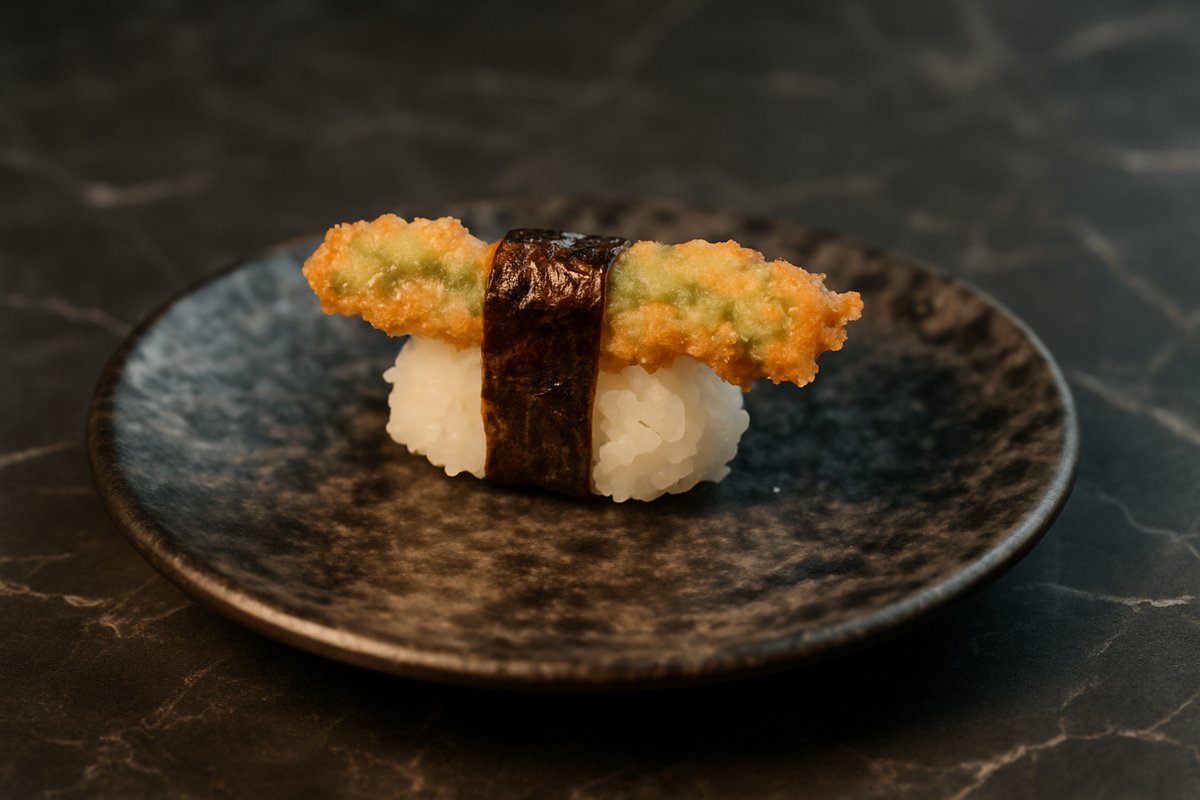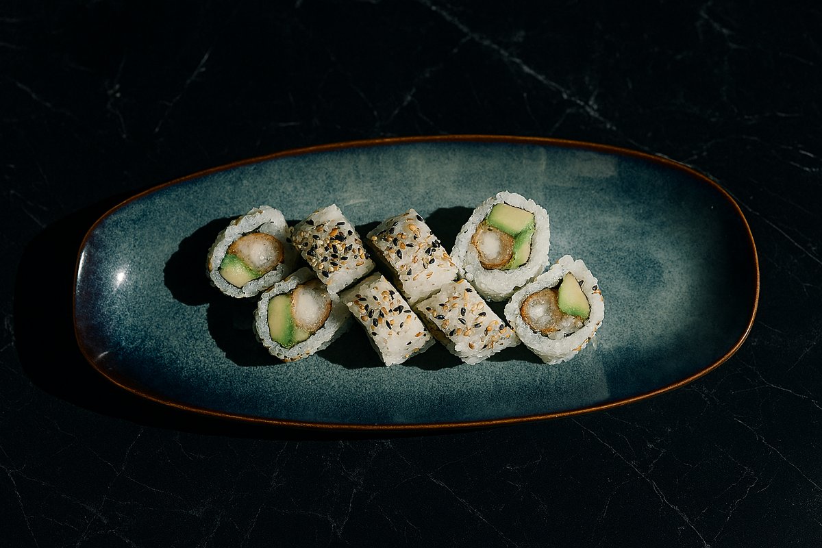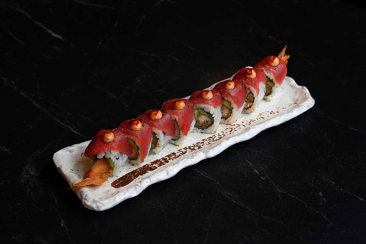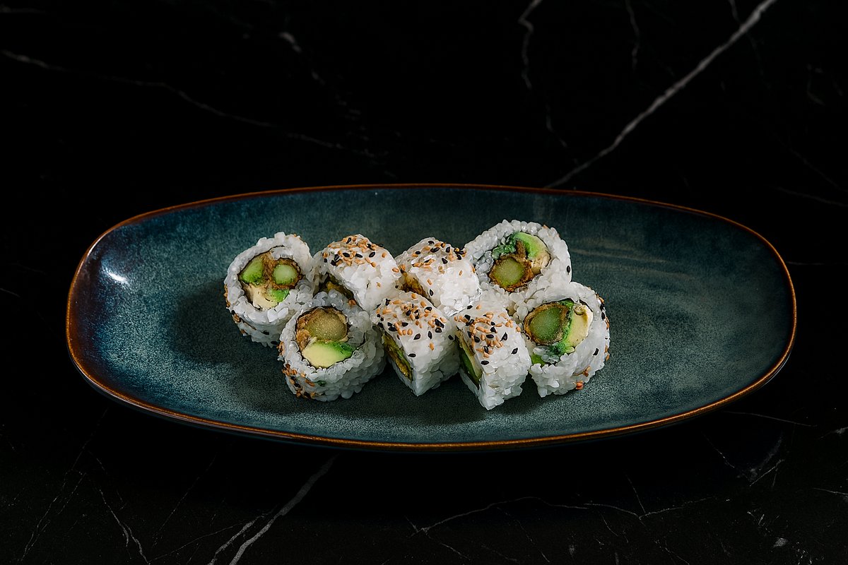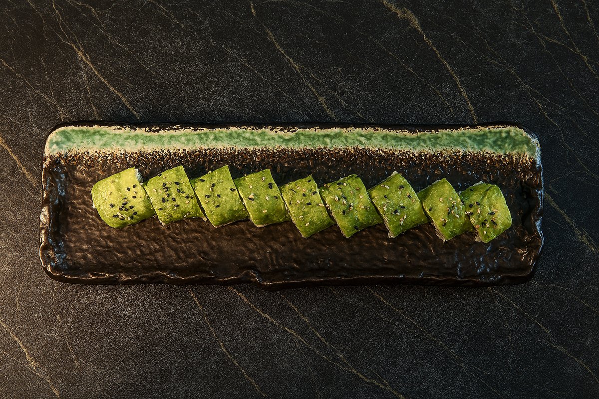 Tempurarejer og avocado, toppet med avocado, chilimayo, teriyaki og sesam.
