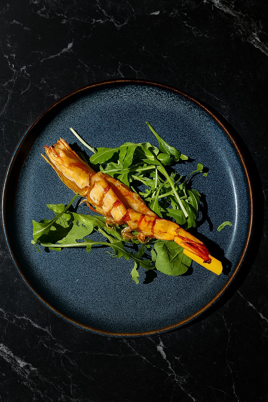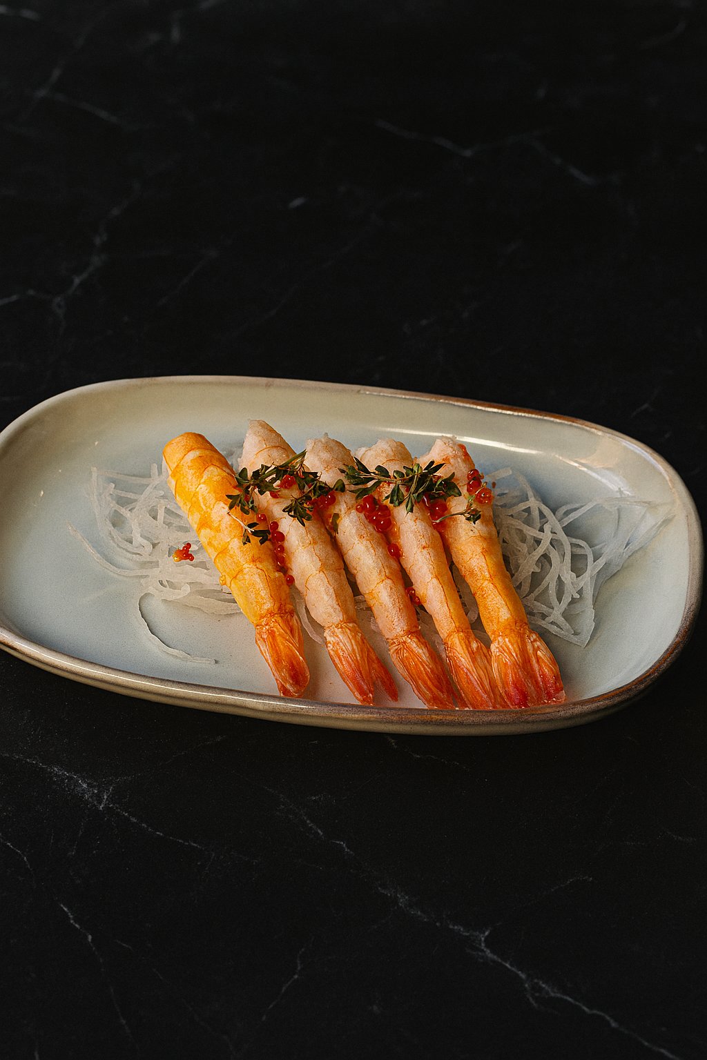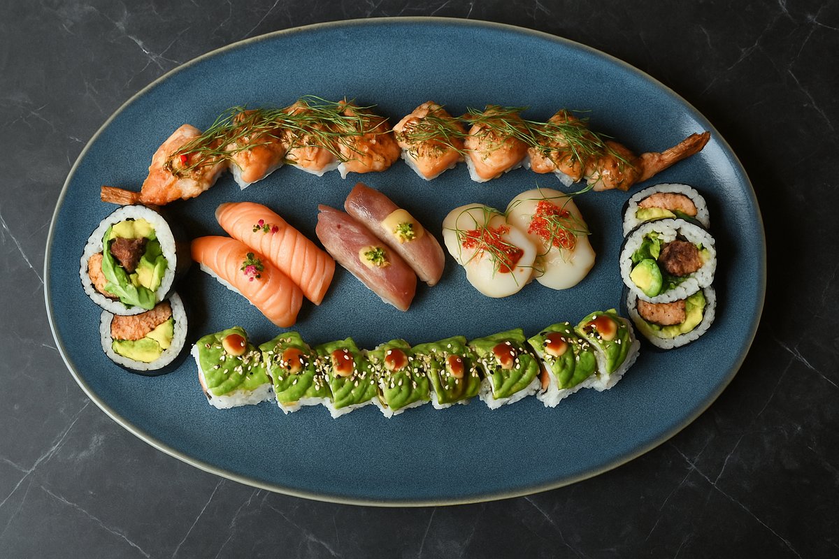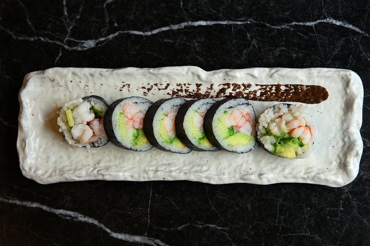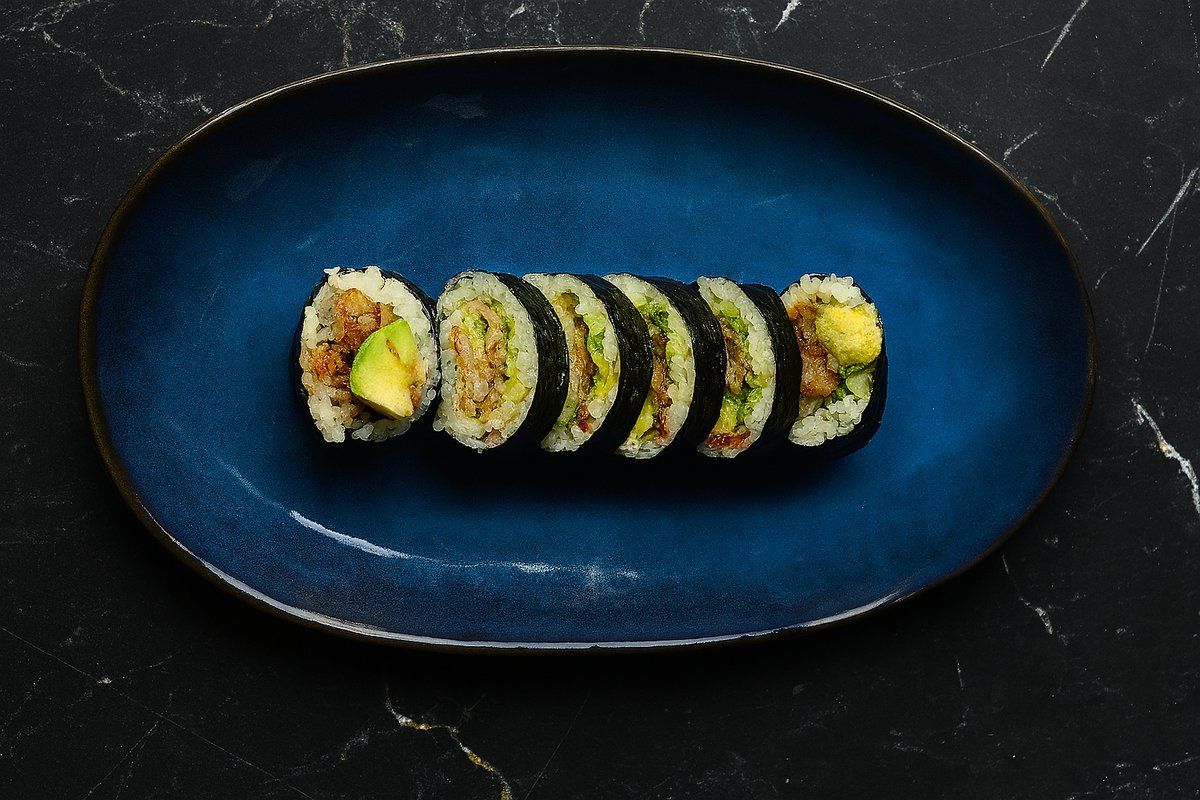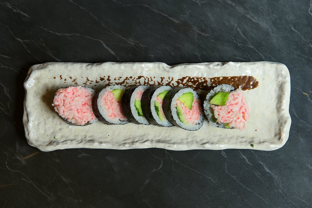 Tempurarejer og avocado, toppet med avocado, chilimayo, teriyaki og sesam.