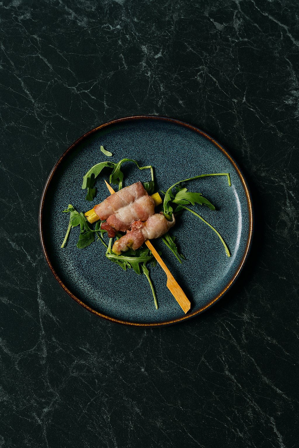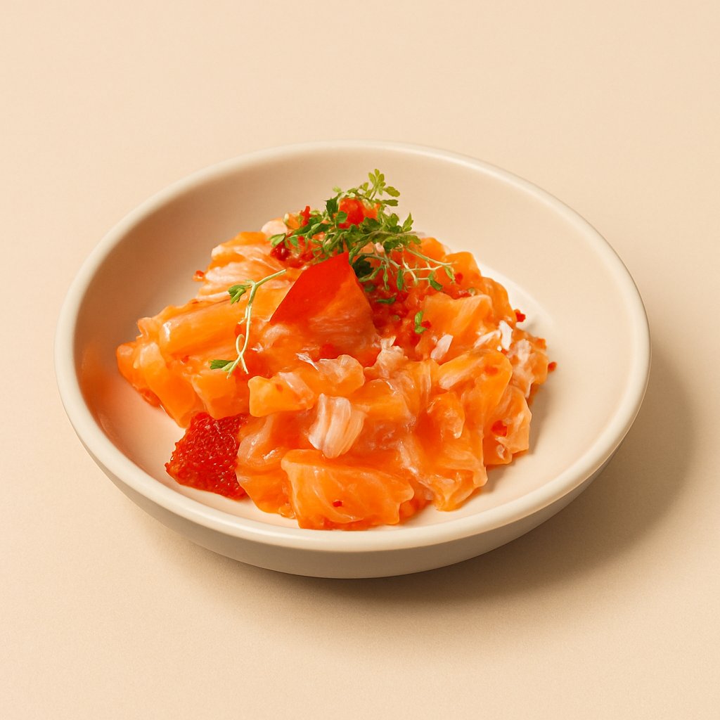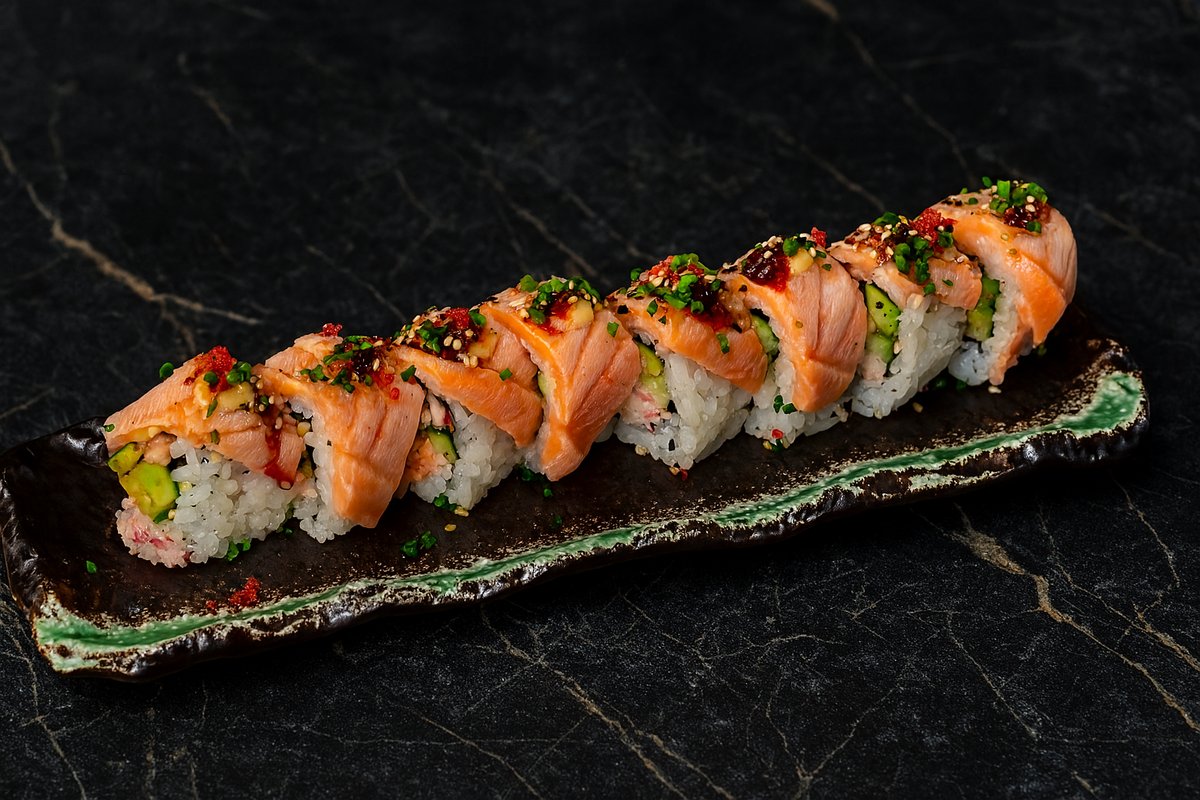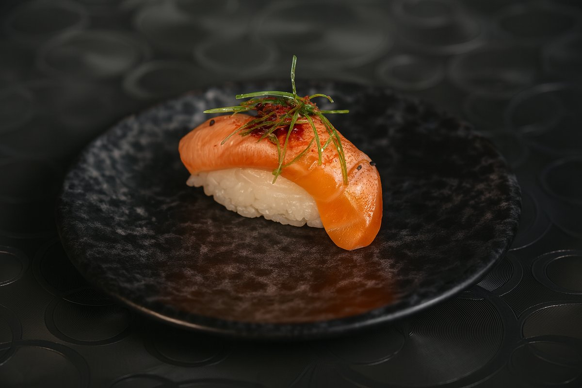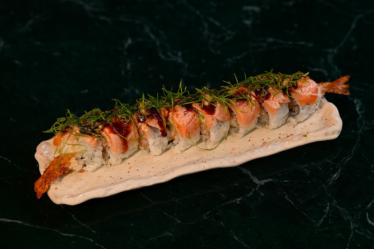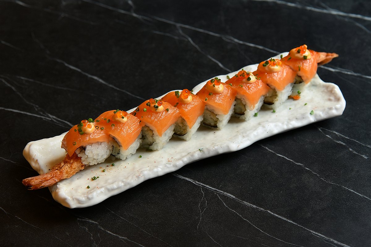 Tempurarejer, surimi og avocado, toppet med flamberet laks, chilimayo, marinerede rødløg og purløg.