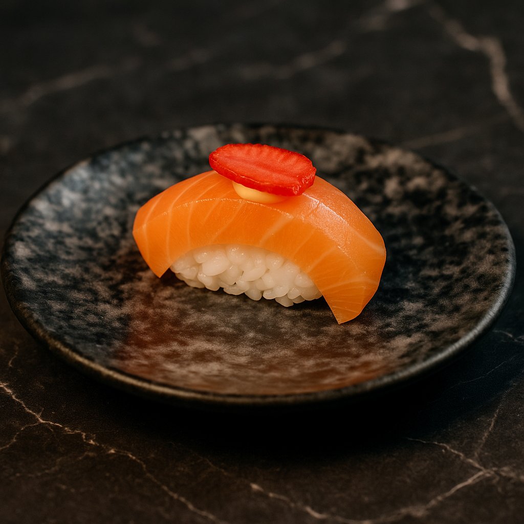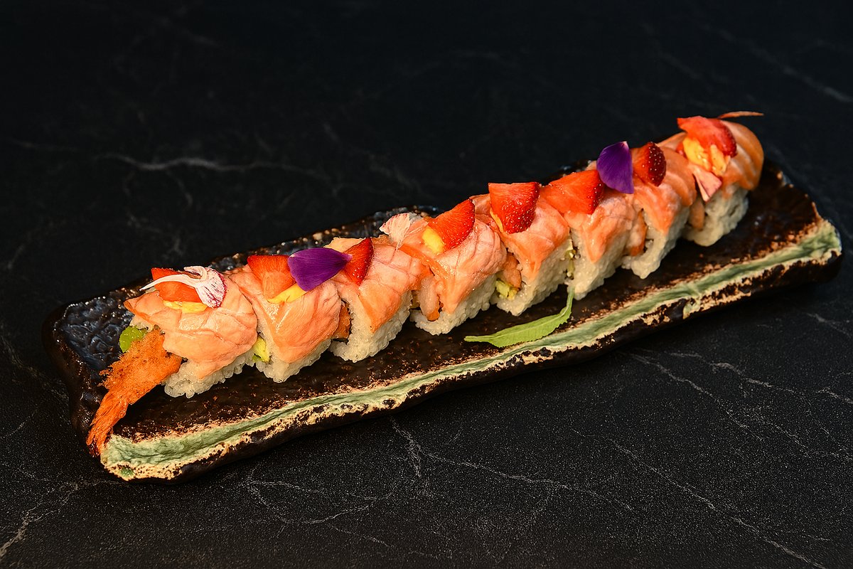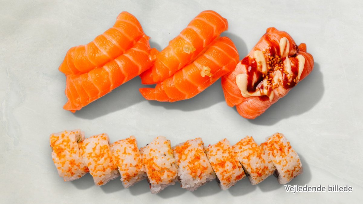 Nigiri: 2 x Laks 2 x Laks m. jordbær Hosomaki: 6 x Laks Uramaki: 8 x Salmon Roll