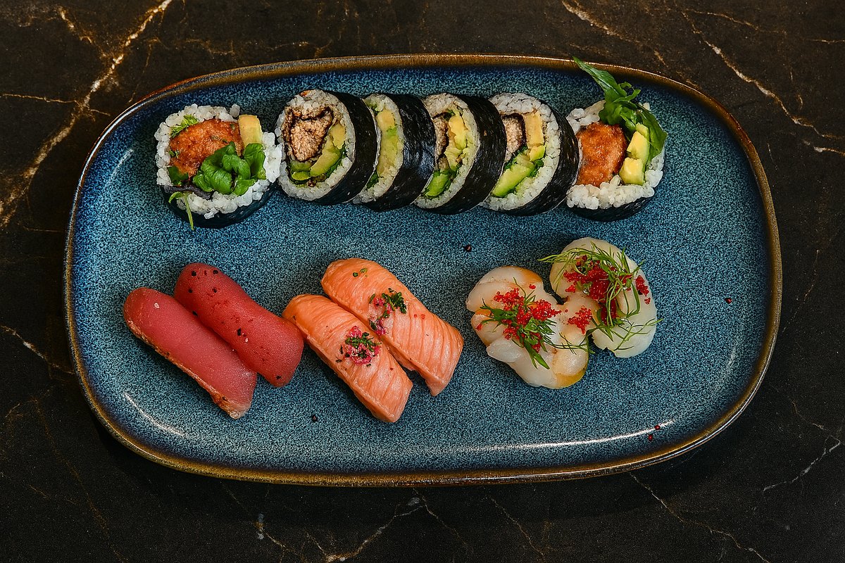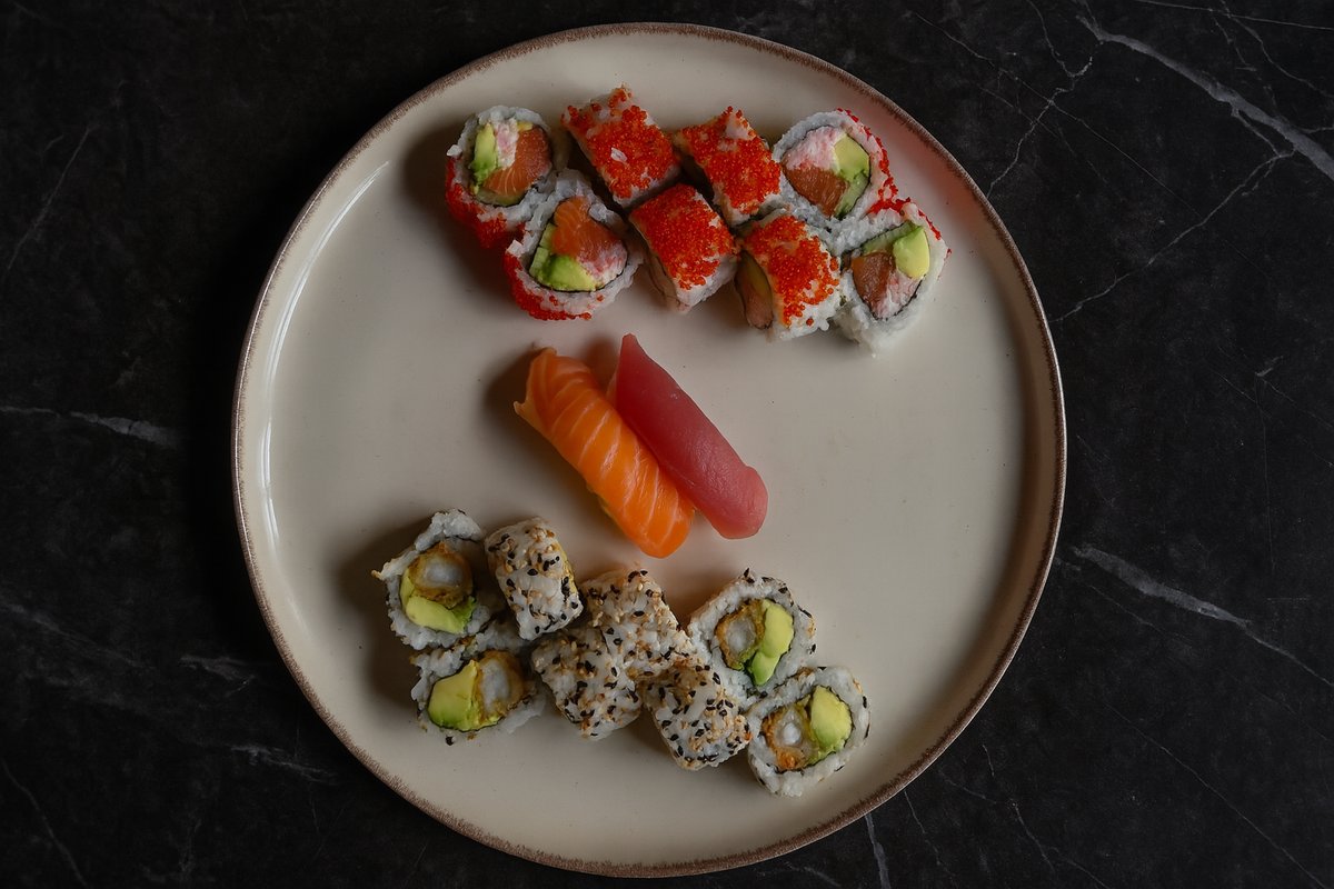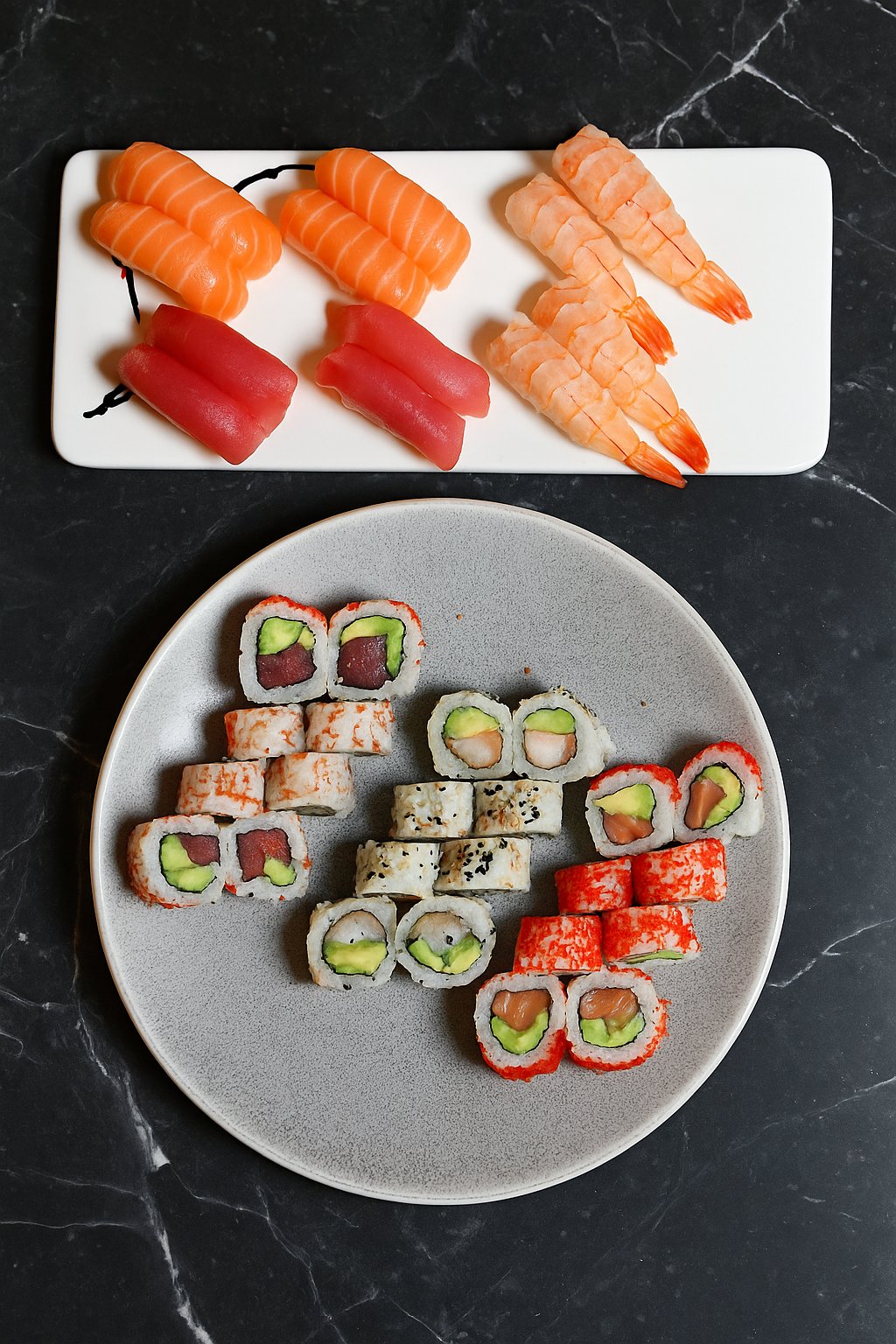 Nigiri: 2 x Laks 1 x Tun 1 x Rejer Uramaki: 4 x Laks 4 x California