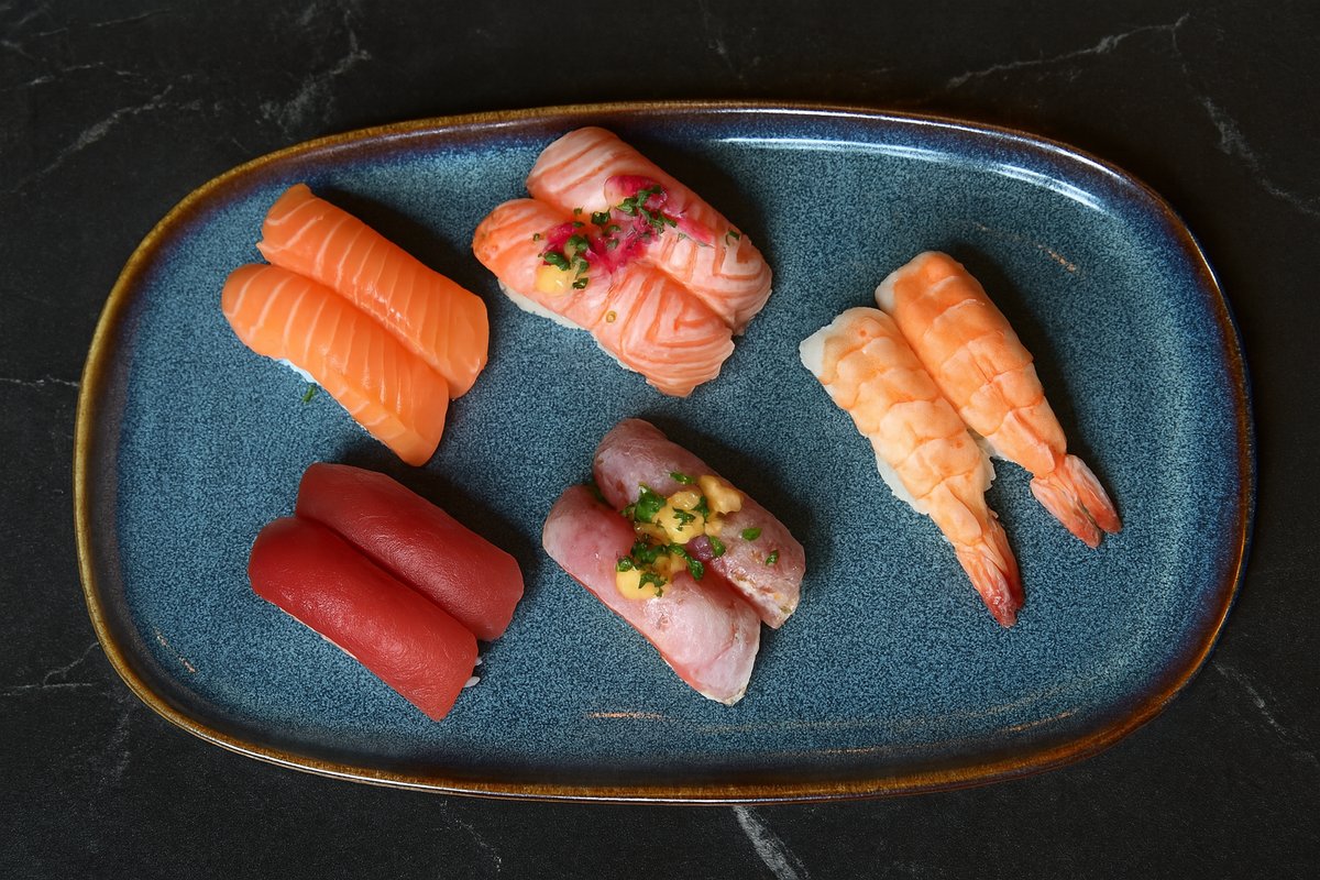Nigiri: 2 x Laks 2 x Flamberet Laks 2 x Tun 2 x Flamberet Tun 2 x Rejer
