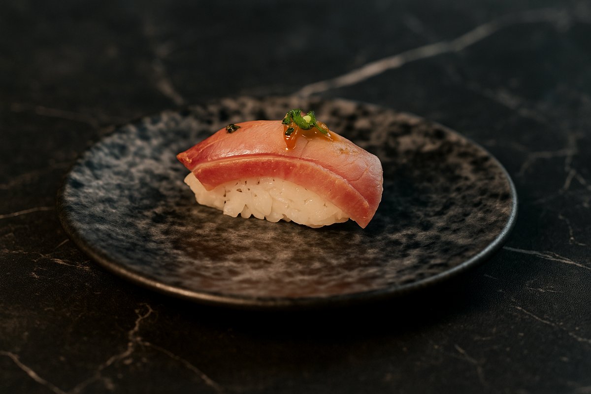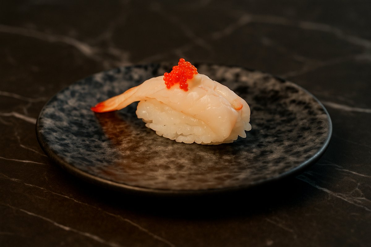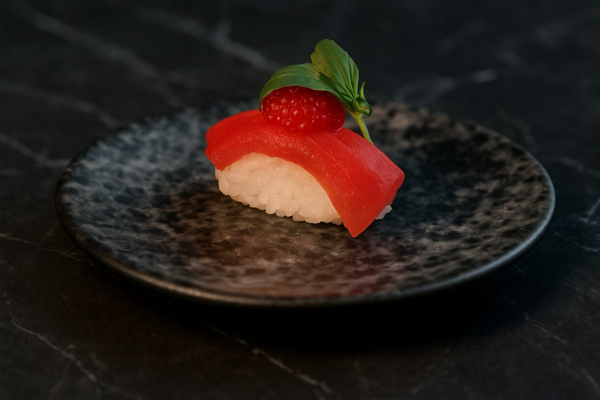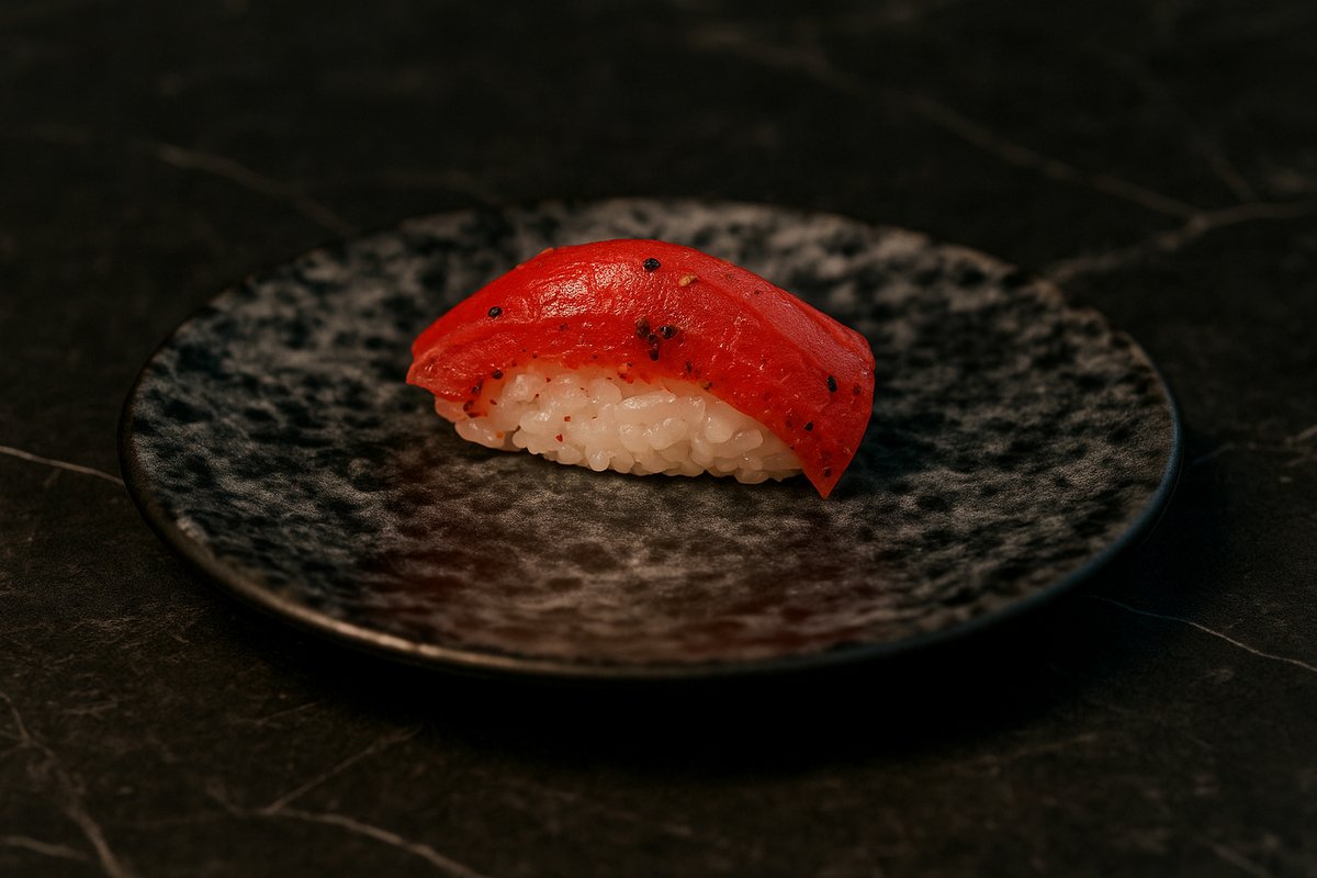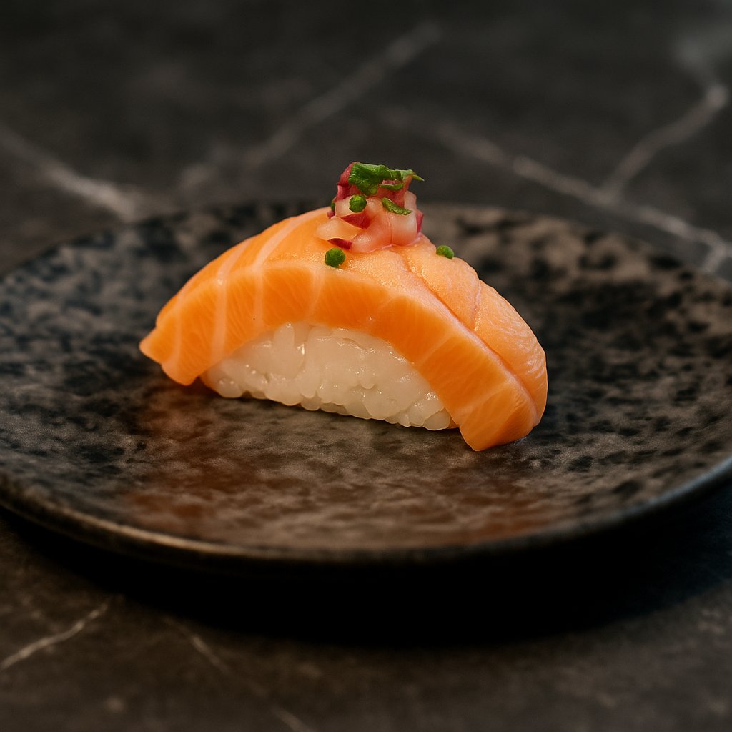 Bolle af ris toppet med rå fisk eller grøntsager, kommer i par af 2 stk.
