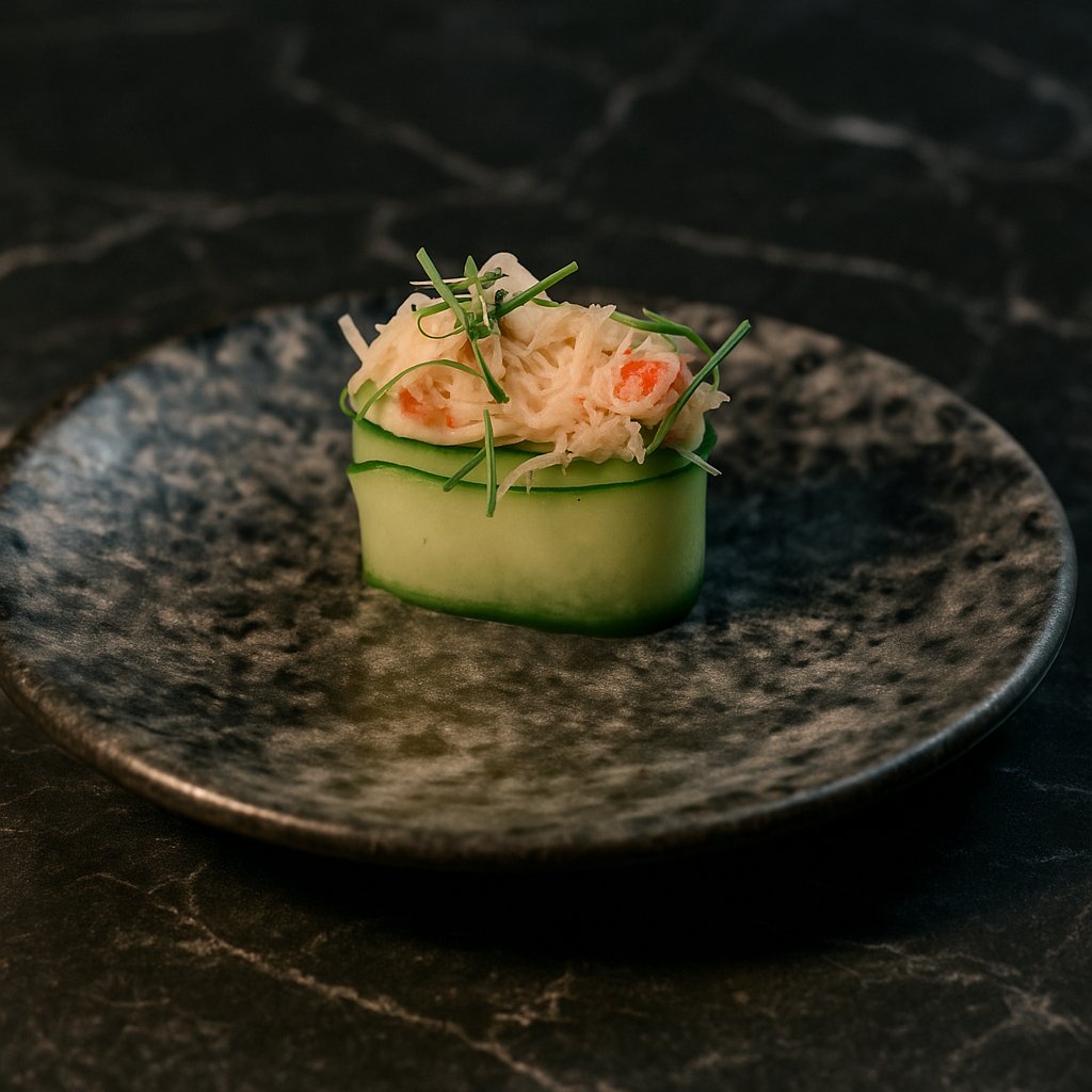 Soft shell crab, tobiko, salat, agurk og teriyaki.