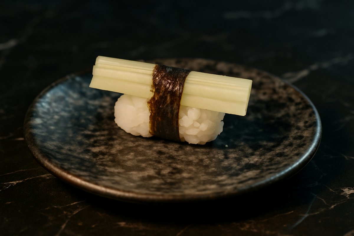 Makirulle omgivet af rispapir, delt i 8 stk.