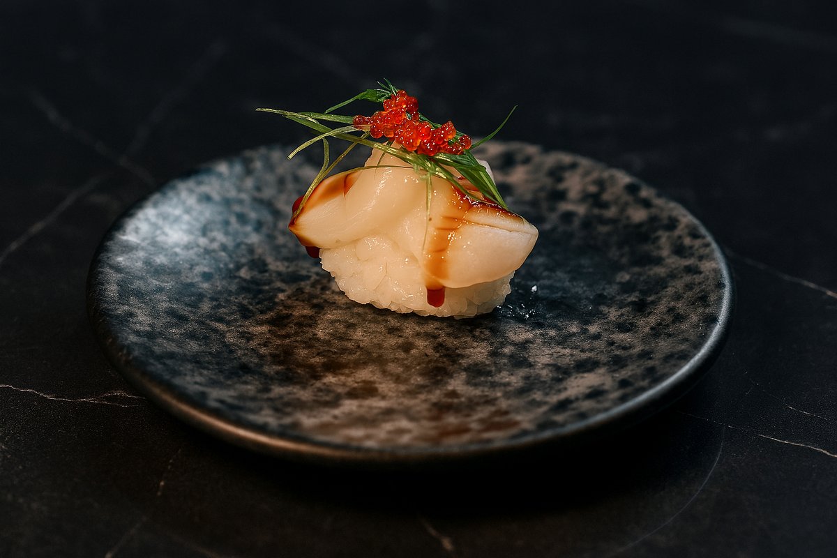 Nigiri: 2 x Flamberet Laks 2 x Tun Tataki 2 x Scallop Deluxe 2 x Tigerrejer m. chilimayo 2 x Unagi Teriyaki