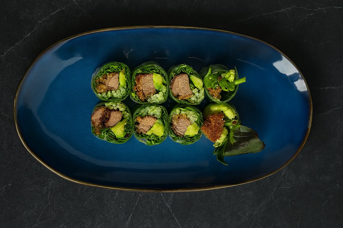 Tempurapaneret and, avocado og salat omgivet af rispapir.
