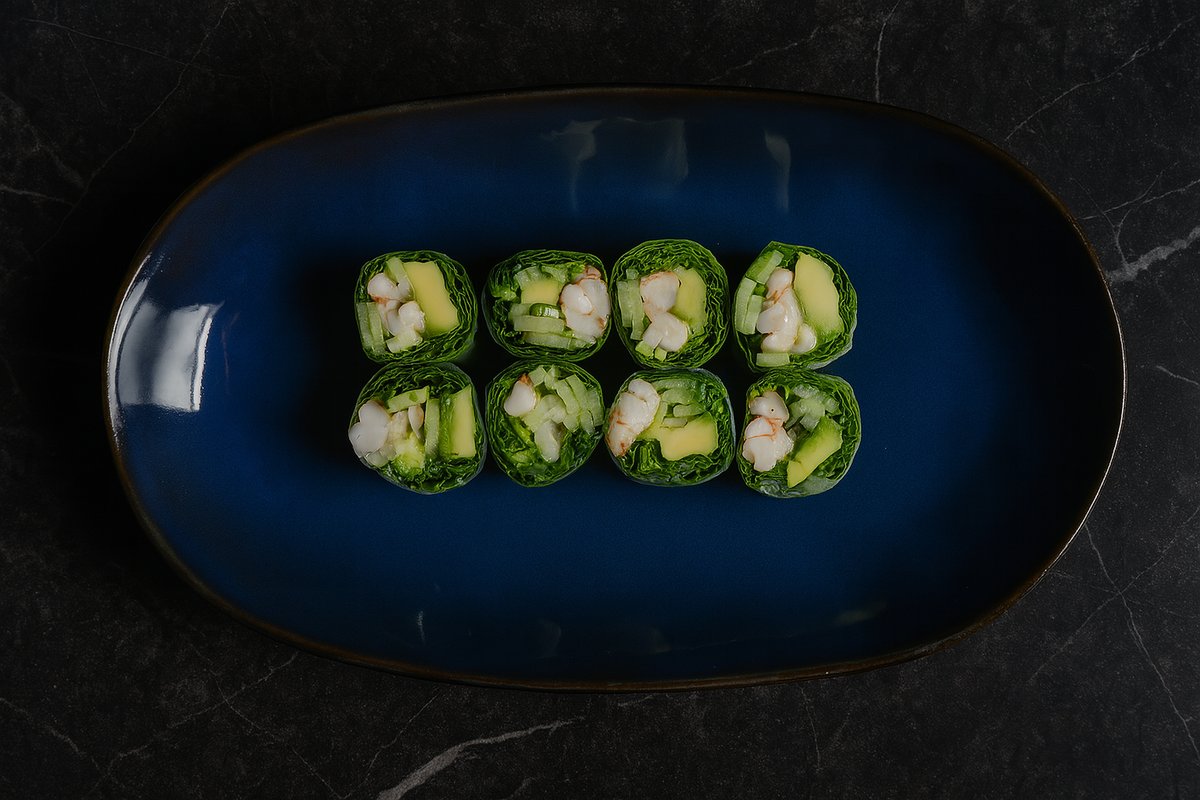 Tempurapanerede rejer, avocado og salat omgivet af rispapir.