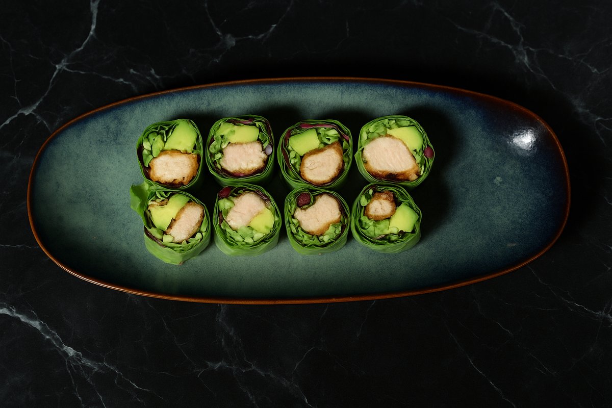Tempurapaneret kylling, avocado og salat omgivet af rispapir.