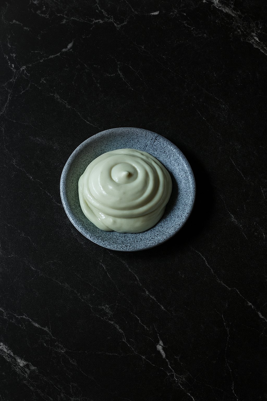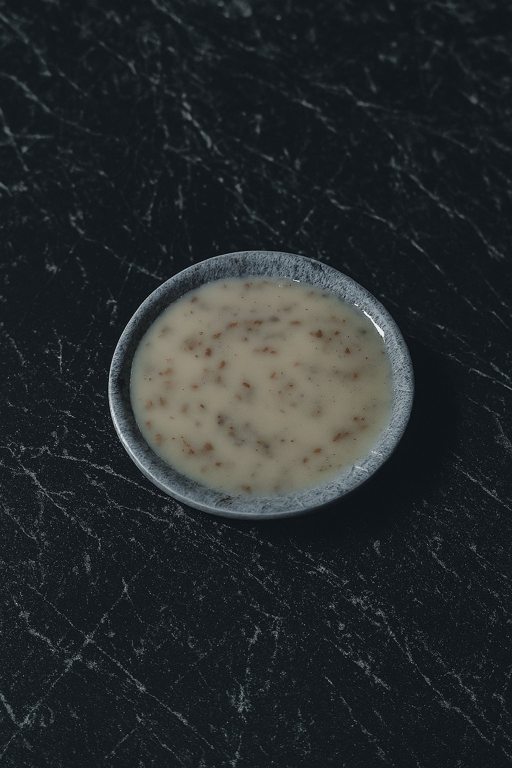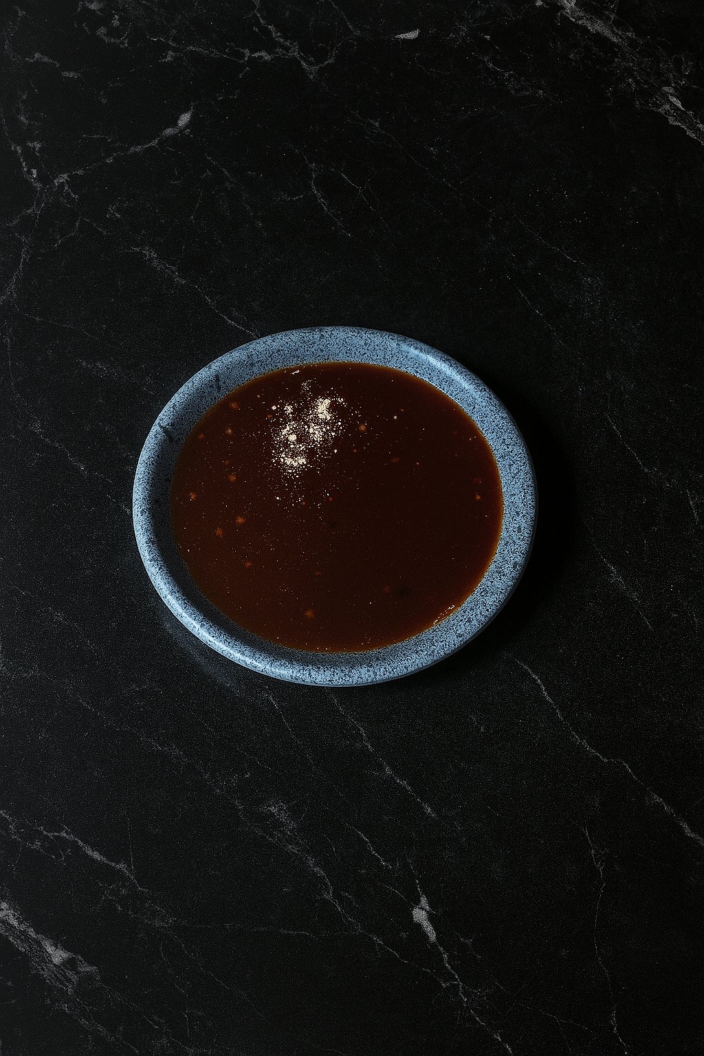 Suppe af stærk sovs med tofu, tang og forårsløg.