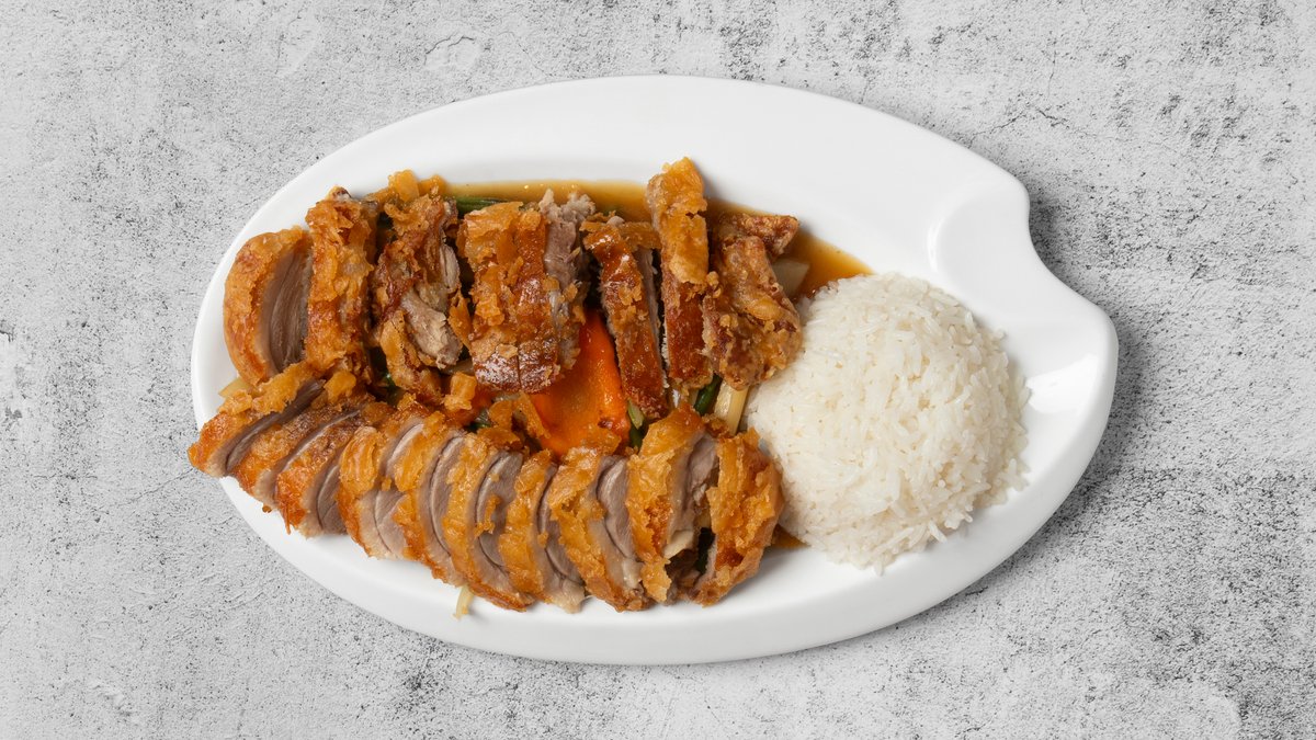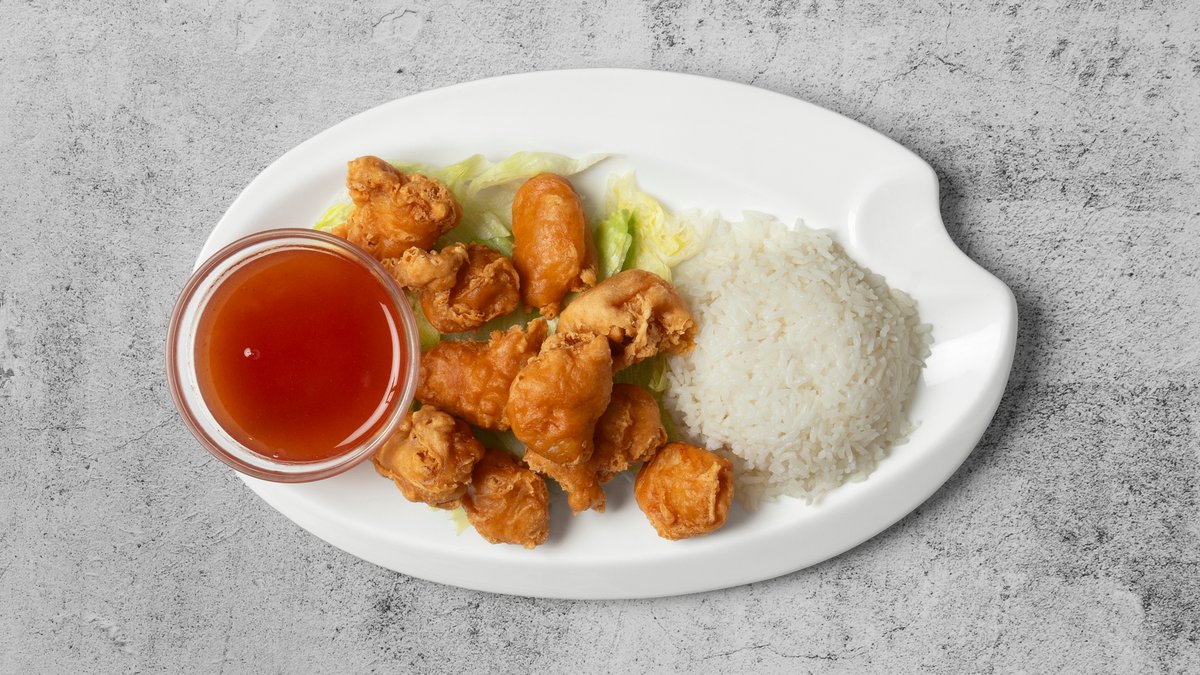 Ris eller nudler toppet med indbagt kylling, indbagte rejer, miniruller og sur sød sauce. Serveres med én valgfri 0,5 sodavand.