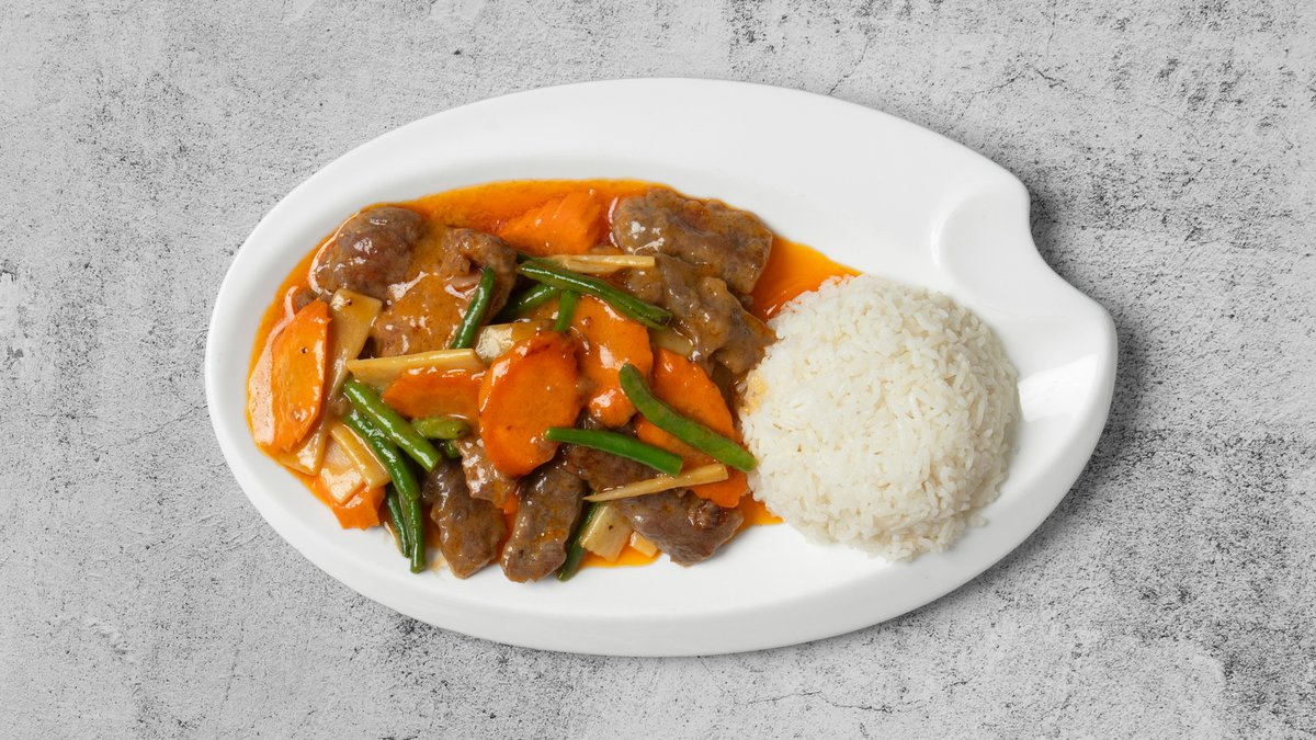 Oksekød stegt i valgfri sauce, serveret med grøntsager og ris.
