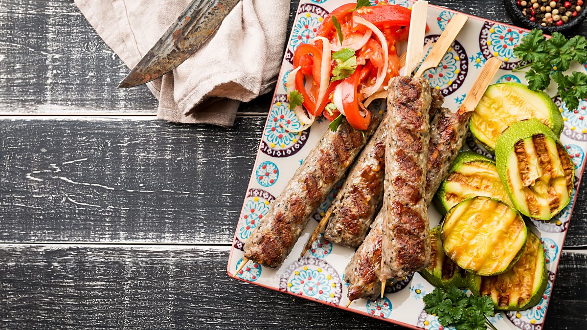 2 x kyllingespyd, 2 x kafta spyd og 2 x kalve spyd serveret med ris, pommes frites, hummus, chili og salat.