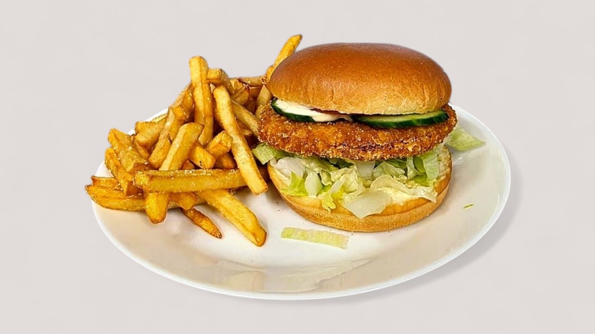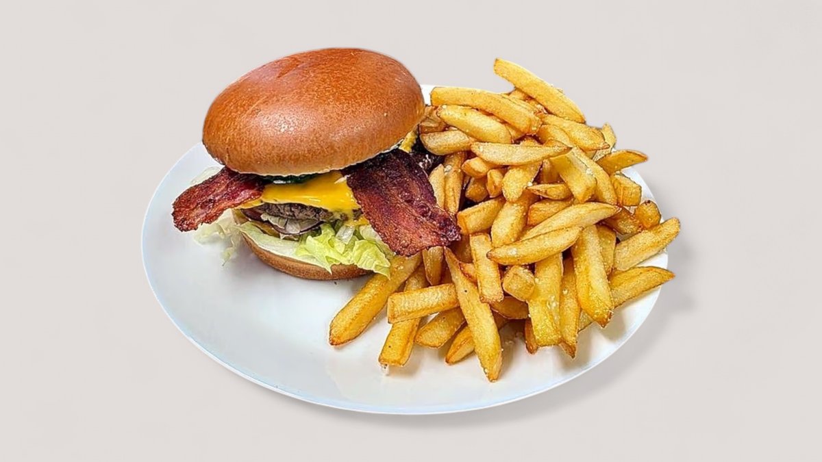 Vores Signatur burger. Bunden smurt med hjemmelavet avokado creme , salat, syltet rødløg, sous vide kalvebøf, ost, bacon, agurk, tomat og toppes med aioli creme. Menuen er inklusiv pommes frites og en dåse sodavand.
