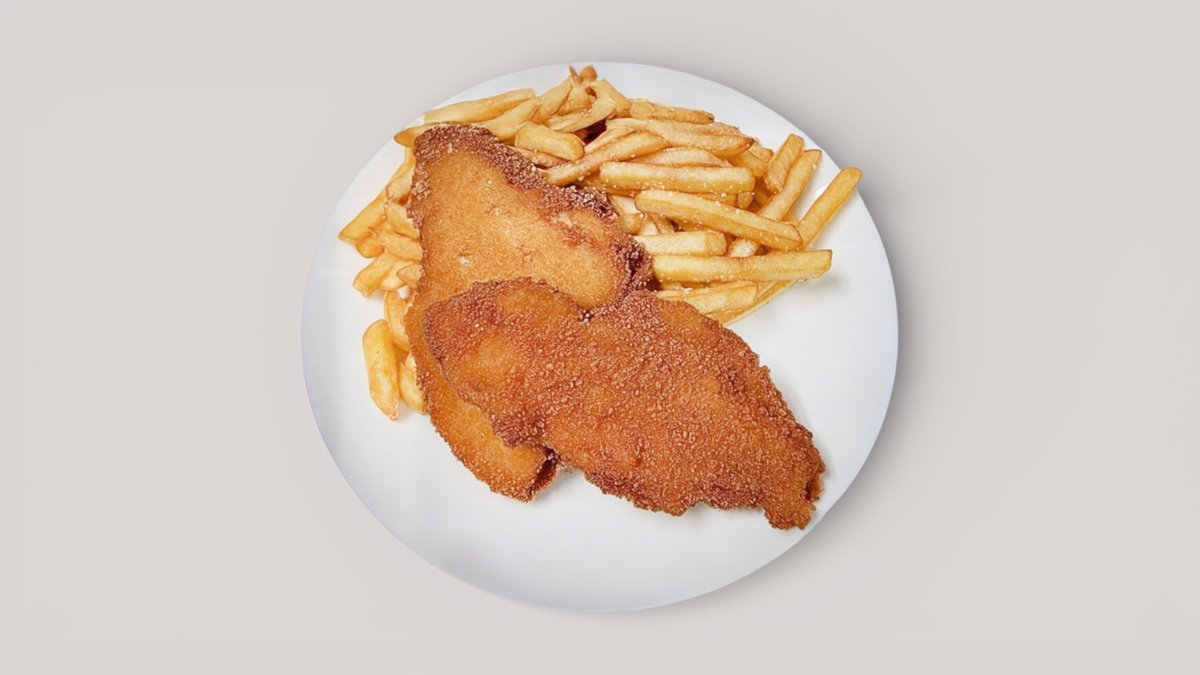 2 stk. friteret rødspættefiler serveret med pommes frites og én valgfri dip.