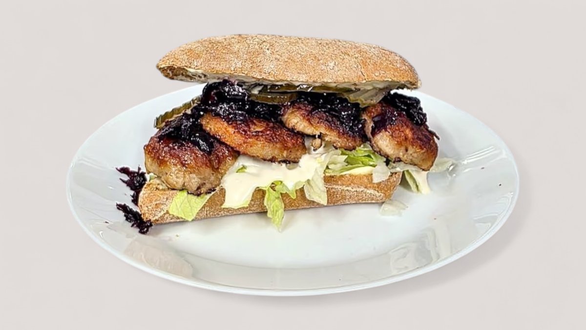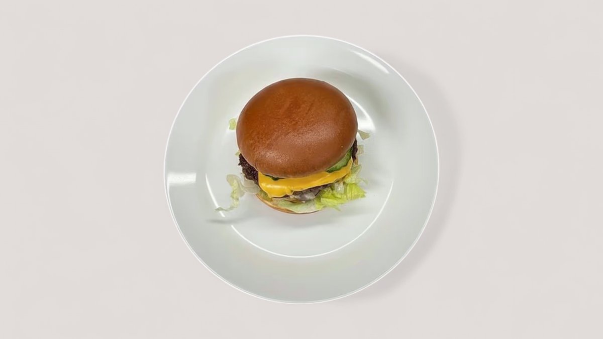 Hakkebøf i burgerbolle med fyld af ost, salat, tomat, agurk, løg og dressing.