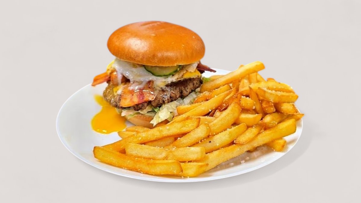 Vores Signatur burger. Bunden smurt med hjemmelavet avokado creme , salat, syltet rødløg, sous vide kalvebøf, ost, bacon, agurk, tomat og toppes med aioli creme. Menuen er inklusiv pommes frites og en dåse sodavand.