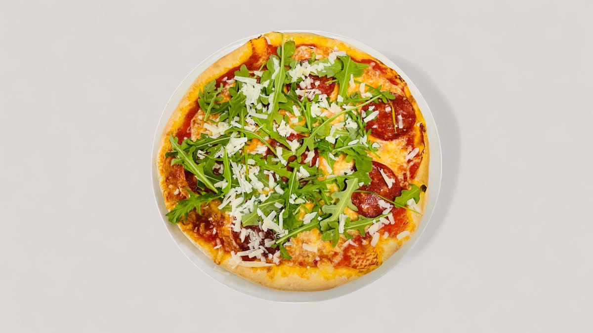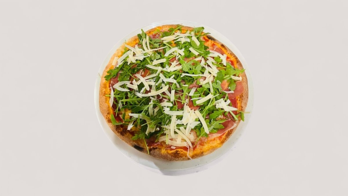Tomatsauce, ost, parmaskinker, rucola og parmesan.