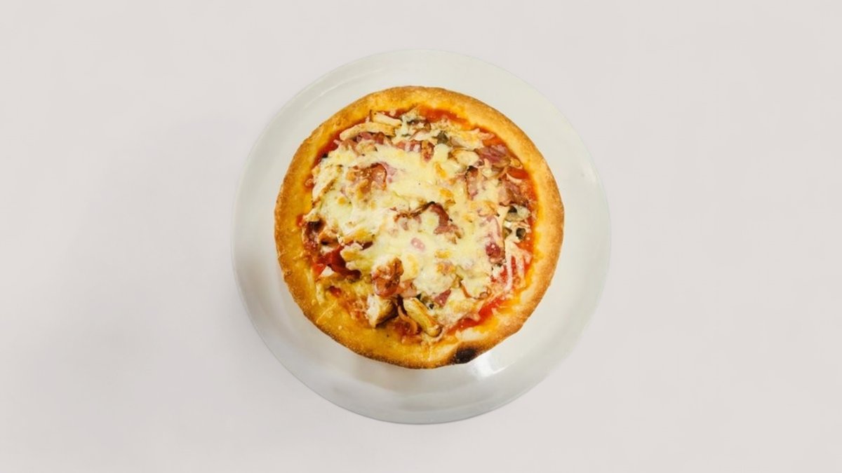Tomatsauce, ost, oregano, kylling, champignon, bacon og pølser.