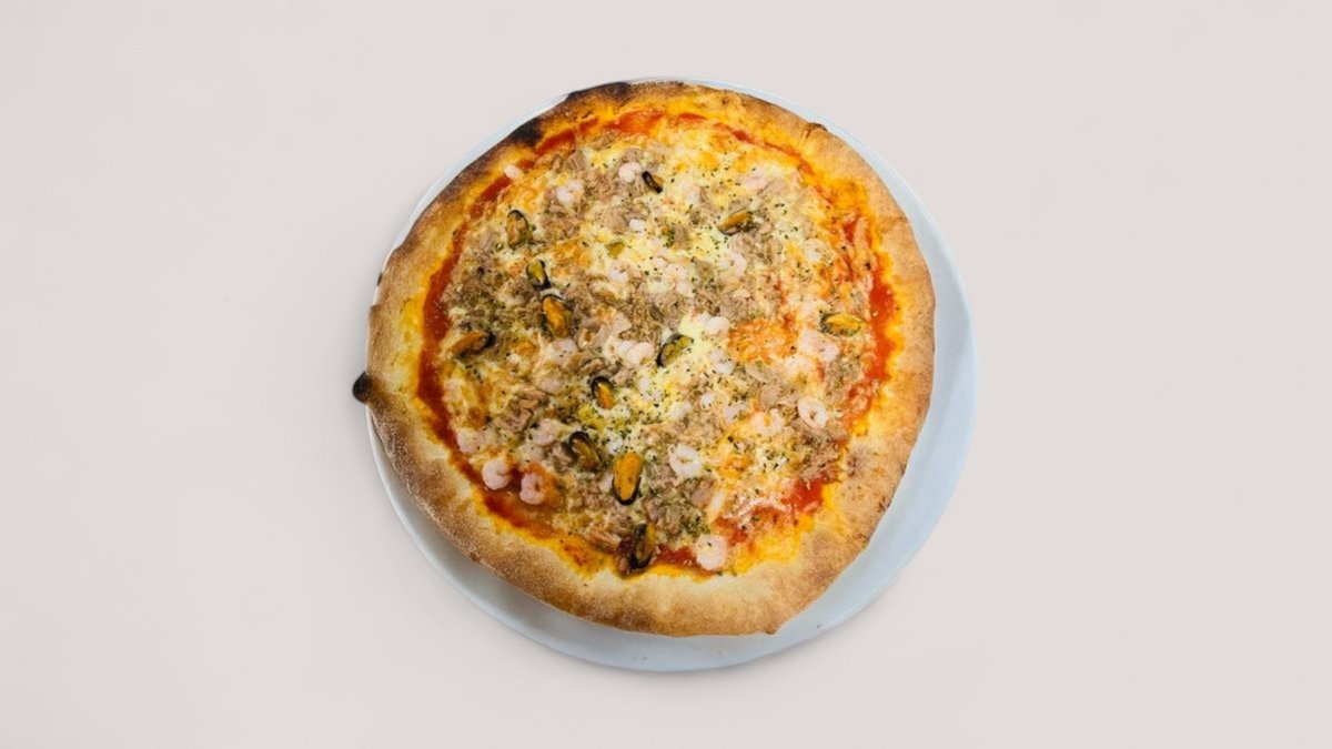 Tomatsauce, ost, oregano, tun, muslinger og rejer.
