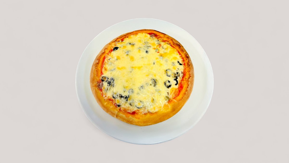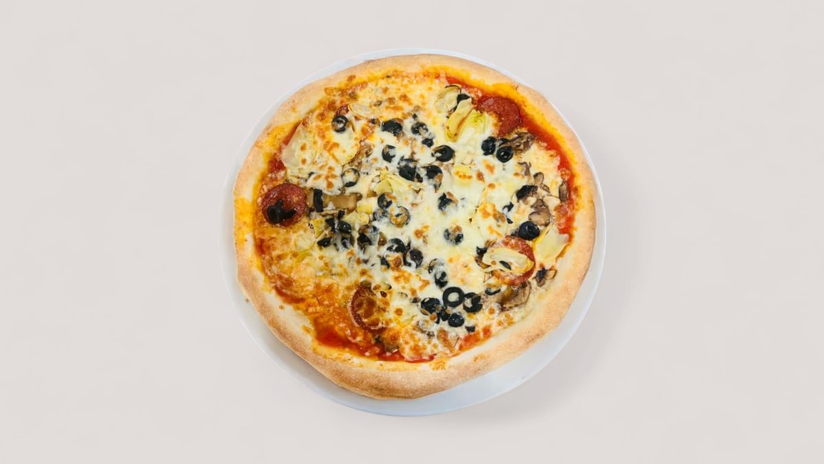 Tomatsauce, ost, oregano, pepperoni, champignon, artiskok, mozzarella og oliven.