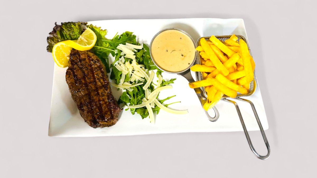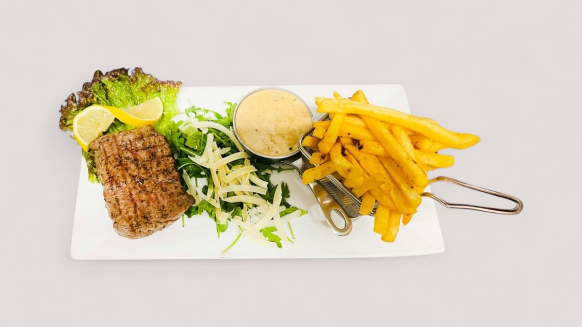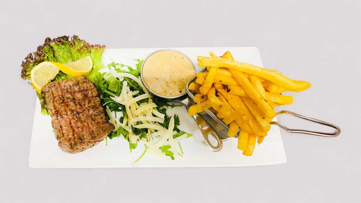 Grillstegt oksefilet med pommes frites og bearnaisesauce. Serveres med valgfri graniture samt salat.