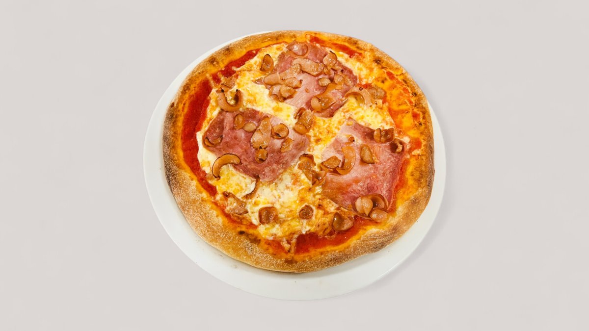 Tomatsauce, ost, oregano, skinke, bacon, champignon og artiskok.
