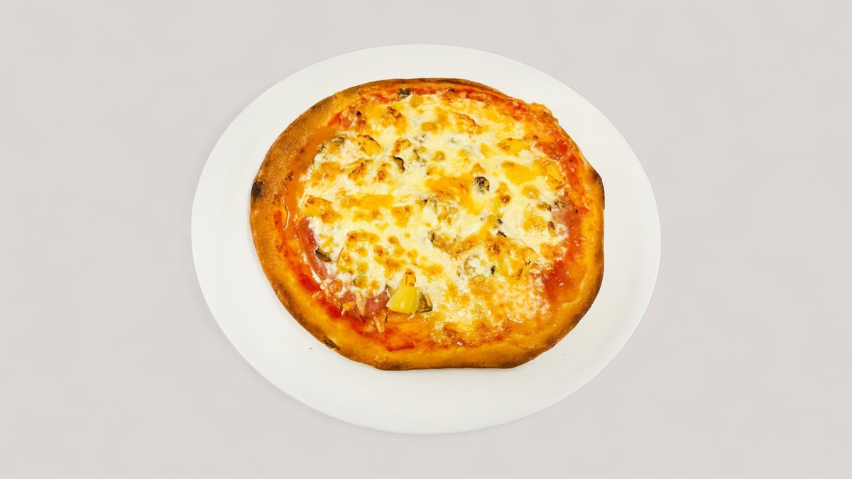Tomatsauce, ost, oregano, skinke, champignon og ananas.