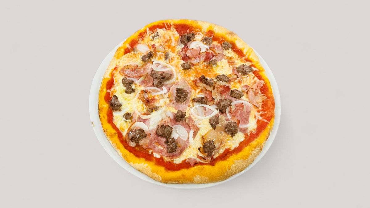 Tomatsauce, ost, oregano, skinke, oksefars, bacon og løg.