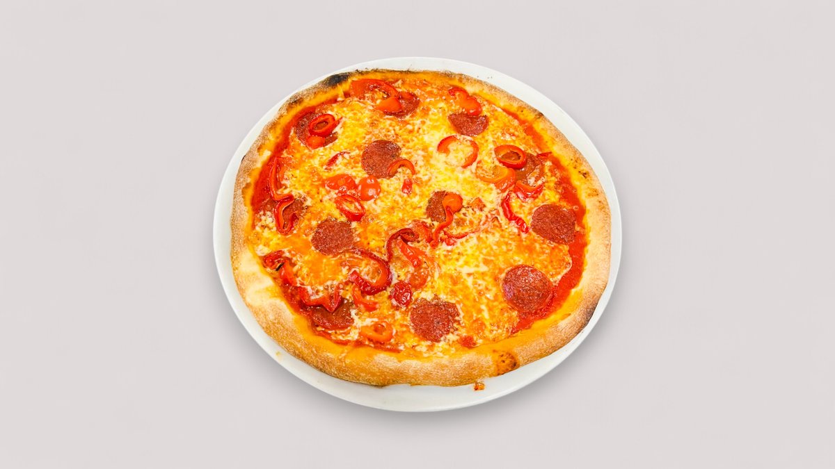Tomatsauce, ost, oregano, oksefars, pepperoni, skinke, rød peber og løg.