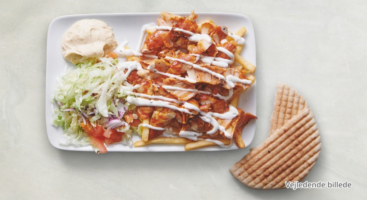 Kebab serveres med pommes frittes, salat, tomat, agurk og dressing.