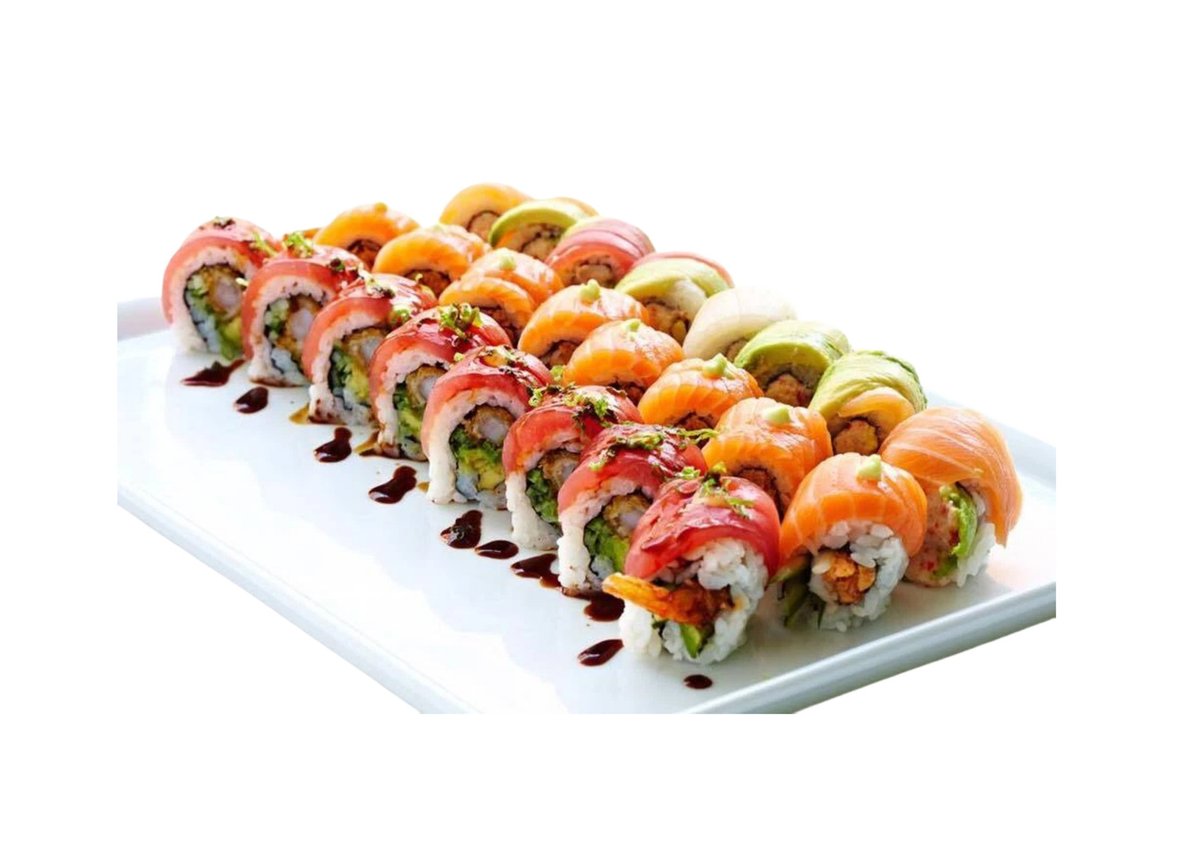 8 x California 8 x Reje tempura 8 x Kylling tempura 8 x Rainbow.