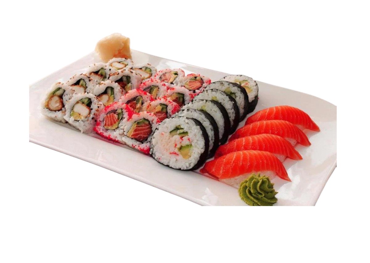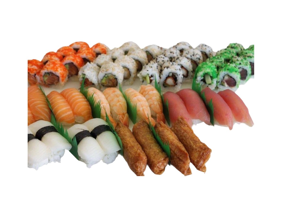 Nigiri: 4 x Tofu 4 x Laks 4 x Tun 4 x Hvid fisk 4 x Rejer Inside-out: 8 x Spicy lak 8 x Rejer tempura 8 x Kylling tempura 8 x Spicy tun
