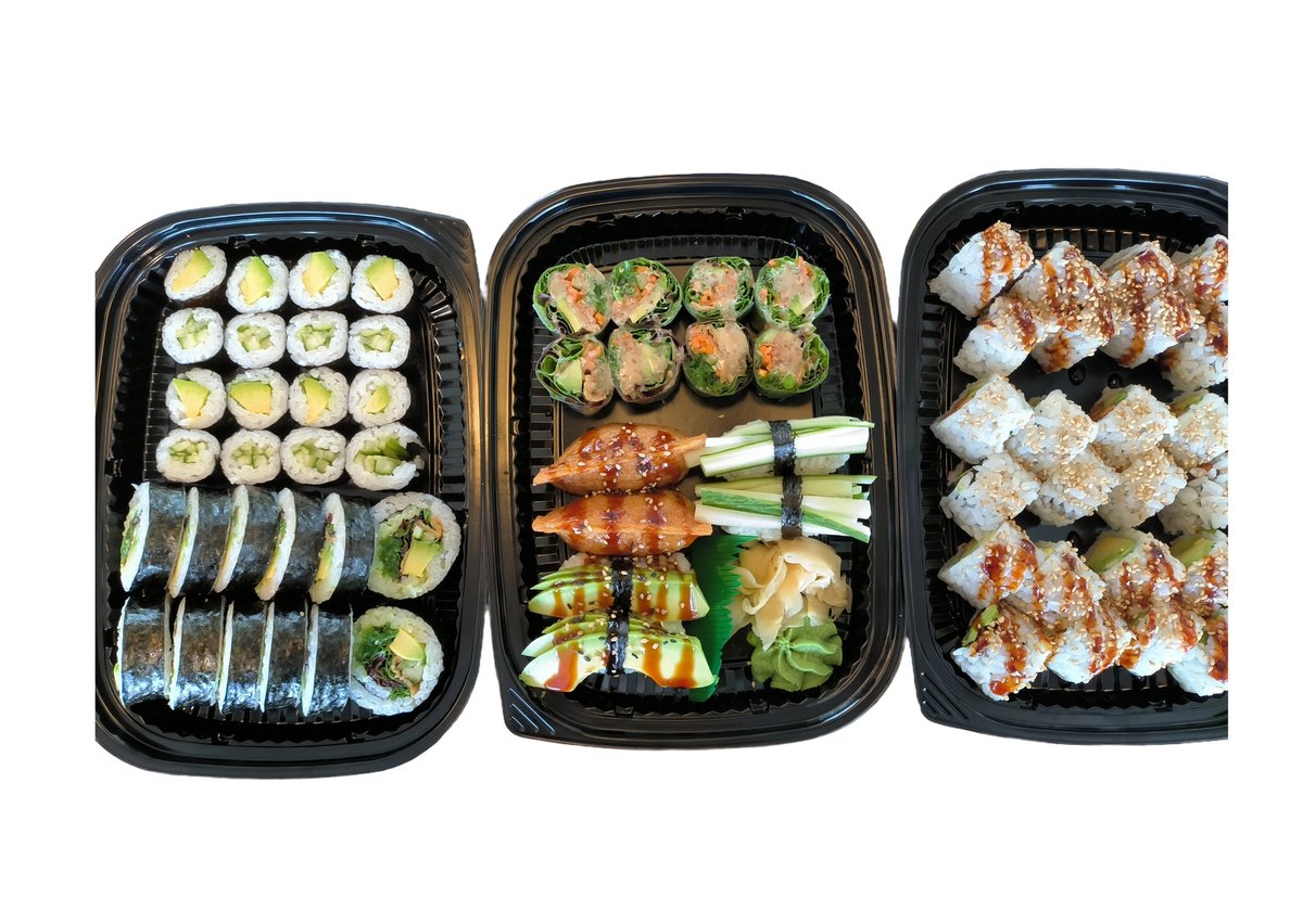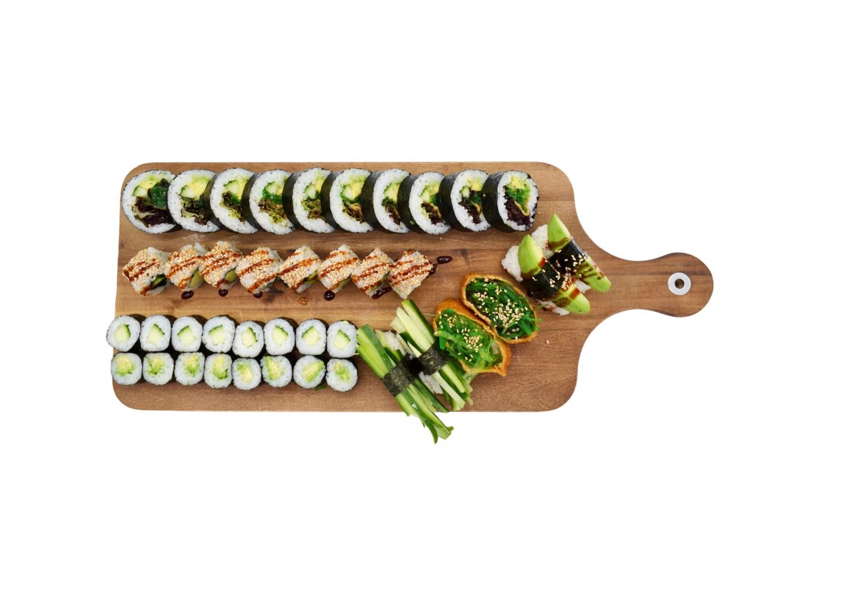 2 stk Nigiri Avocado 2 stk Nigiri Agurk 2 stk Nigiri Tofu 8 stk Rispaper Vegansk 8 stk Inside Out Avocado 8 stk Inside Out Asparges 8 stk Inside Out Søde Kartofler 8 stk Hosomaki Avocado 8 stk Hosomaki Agurk 12 stk Futomaki Veganske