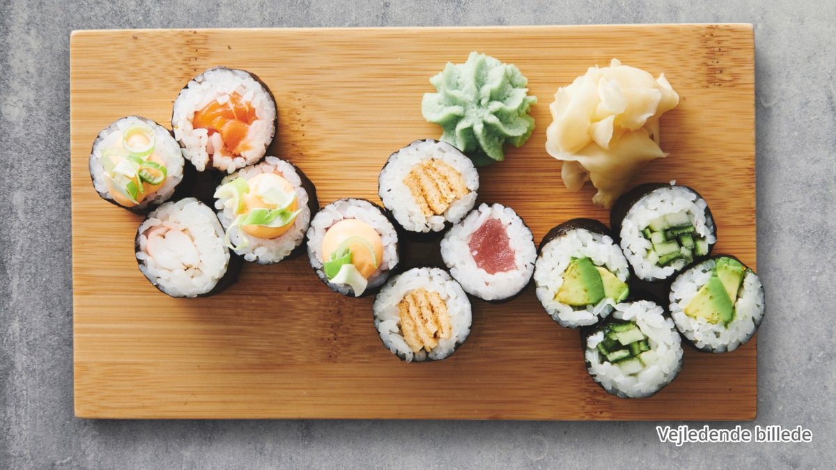 Stor makirulle omgivet af tang, delt i 6 eller 12 styk. V - Vegetarisk.