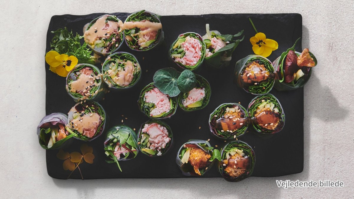 California med mayonnaise, agurk, avocado, toppet med laks, tun, reje, hvidfisk og avocado.