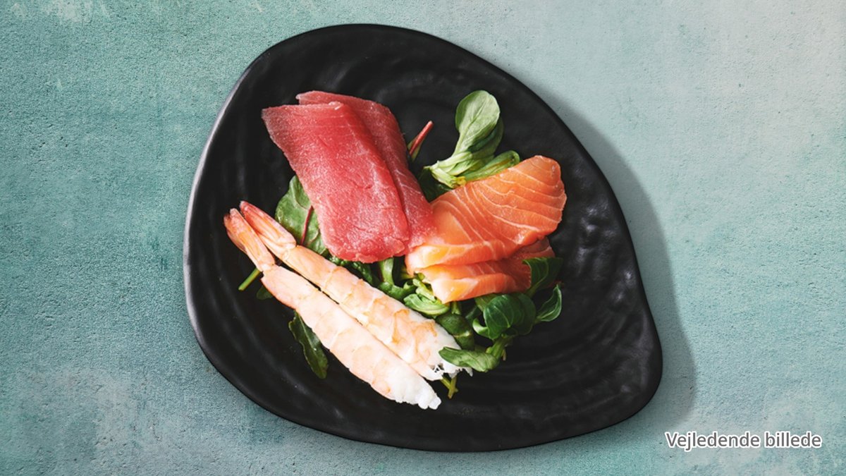 Inside-out: 8 x Spicy laks 8 x Rejer tempura 8 x Love roll Sashimi: 4 x Laks sashimi