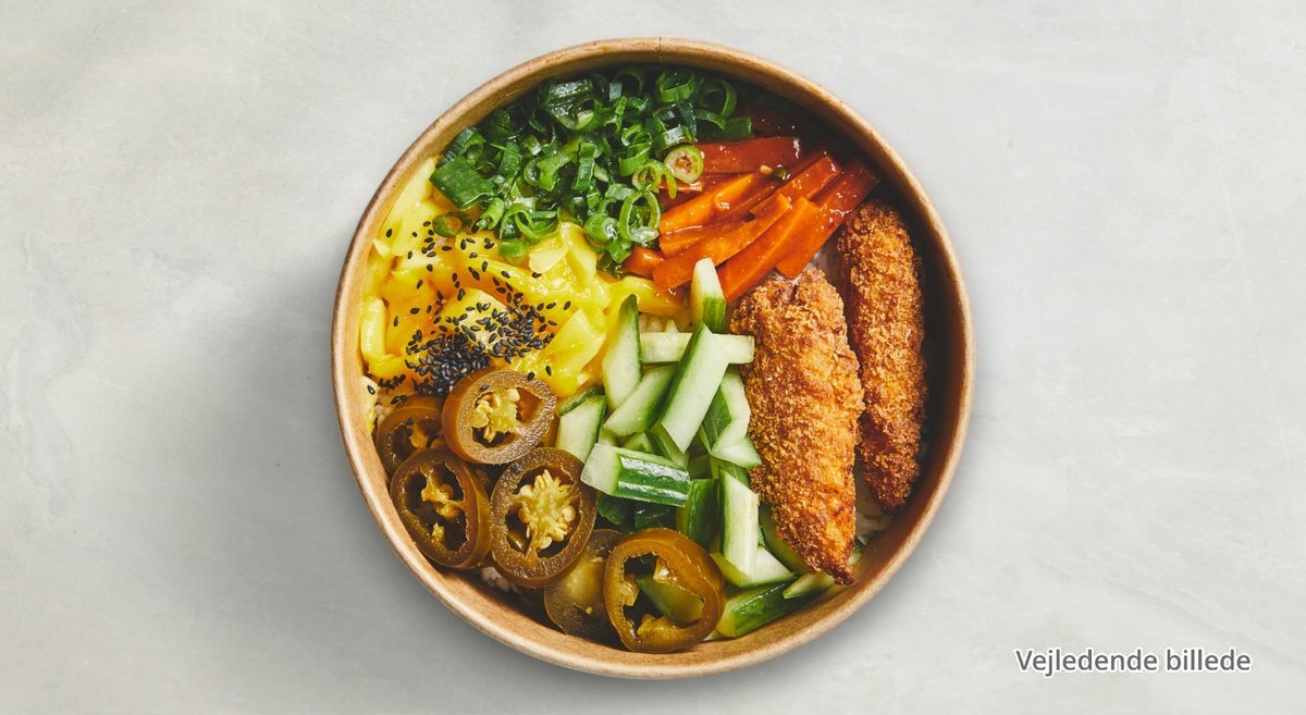 Dybstegt paneret rejer, avocado, agurk og chili mayo.