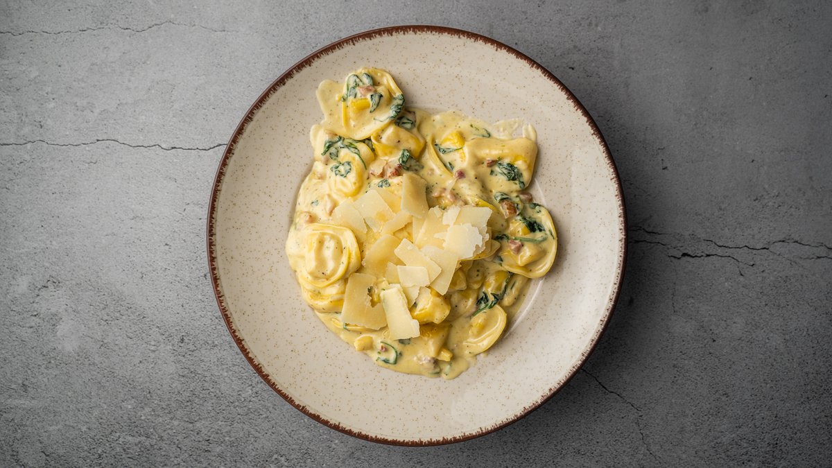 Tortellini med bacon, spinat, hvidløg, fløde, æggeblomme, olivenolie og parmesan.