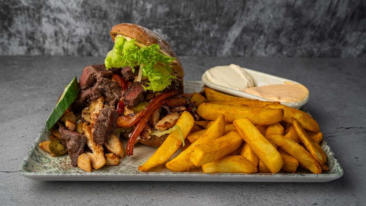 Rustik surdejsbrød med chilimayo, lynstegt oksekød, kyllingestrimler, champignon, peberfløde, rødløg, tomat, agurk, jalapeños, salat og pommes frites.
