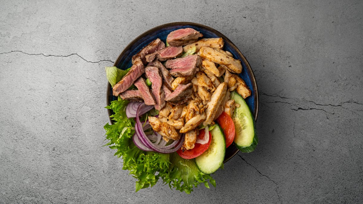Kyllingestrimler, lynstegte oksestrimler, mix salat, tomat, agurk, løg, olie-dressing, aioli, chilidressing og brød.