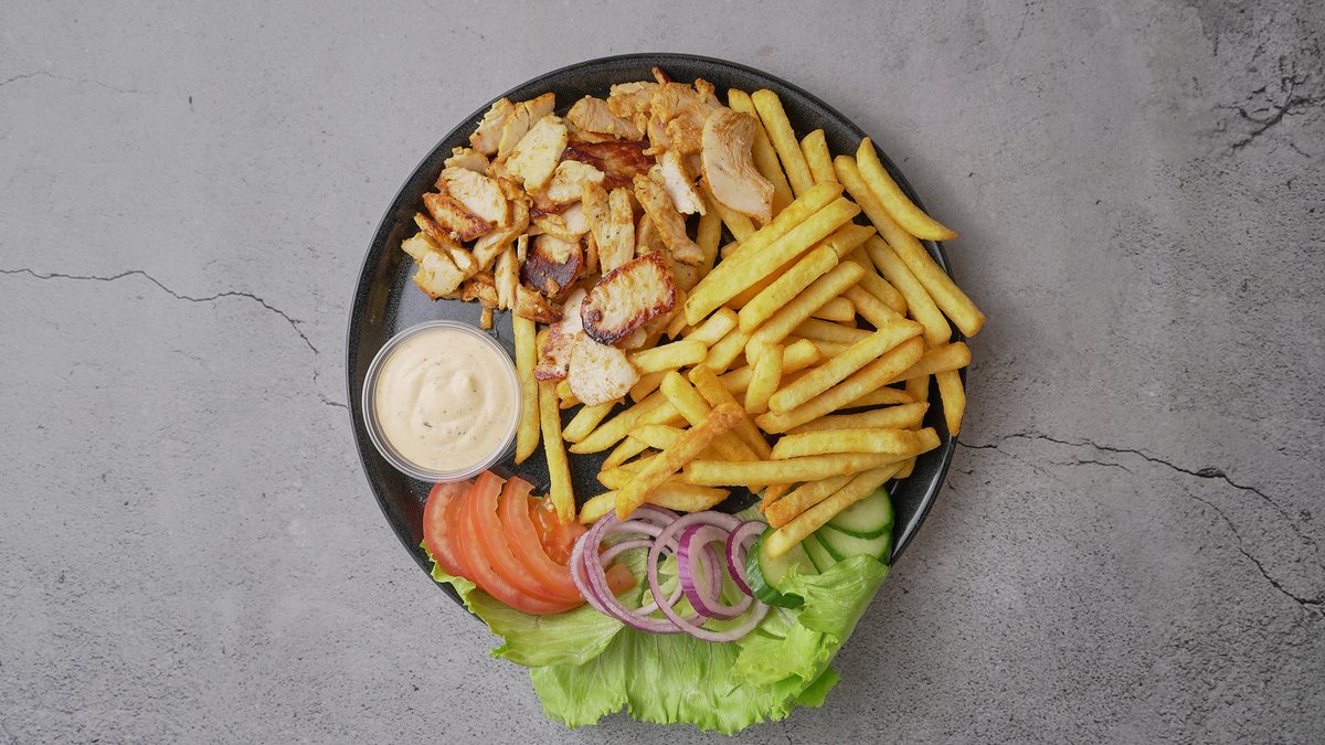 Kebab- og kyllingemix serveres med pommes frites, iceberg-salat, toamt, agurk, løg og dressing.