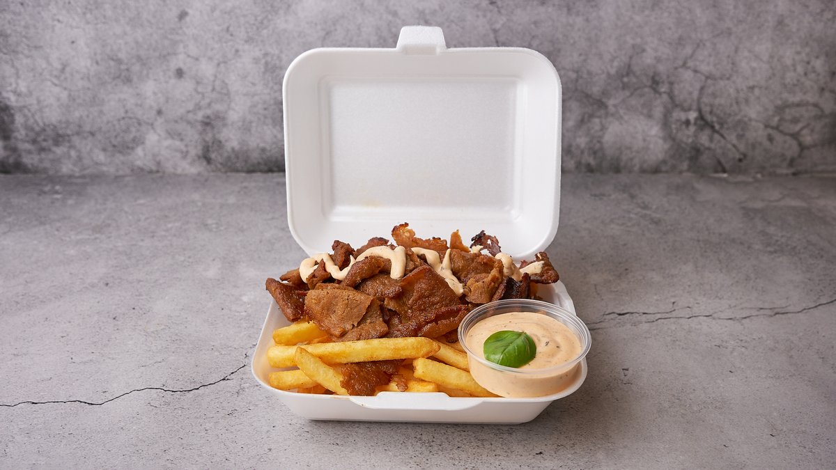 Kebab, pommes frites og dressing.