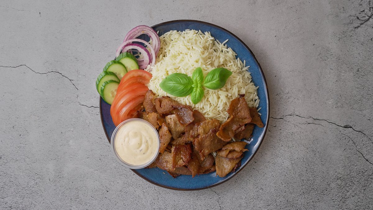 Kebab serveres med ris, iceberg-salat, toamt, agurk, løg og dressing.