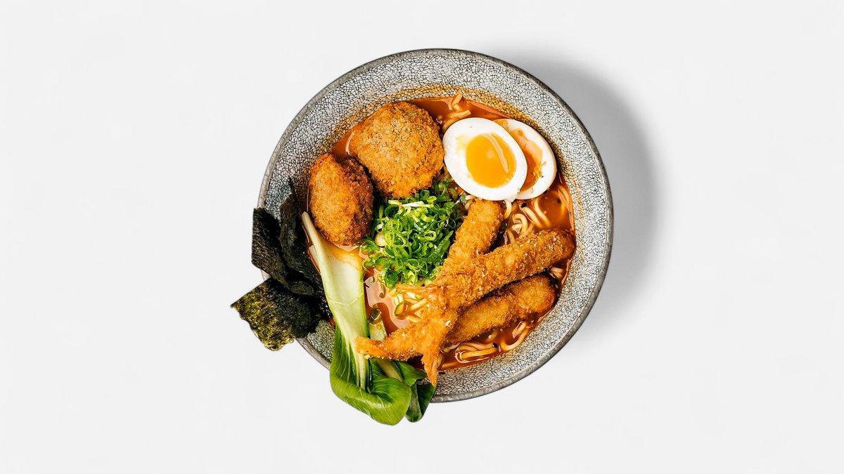 Ramen med valgfri suppe, pak choi, marineret æg, sprøde tempurarejer, svampe, friske forårsløg, sesamfrø og nori-tang.
