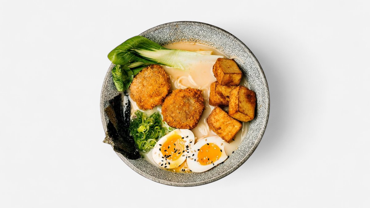 Ramen med valgfri suppe, saftigt svinekød, pak choi, marineret æg, sprøde tempurastegte svampe, friske forårsløg, sesamfrø og nori-tang.