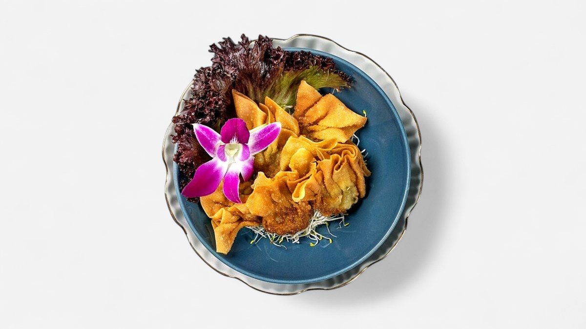 Sprøde wontons med krydret fyld af kylling, rejer, forårsløg og koriander. Serveres med blommesauce.