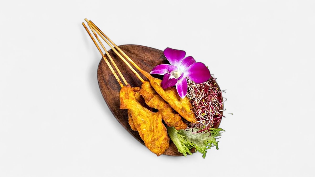 Kyllingespyd marineret i karry og kokosmælk. Serveres med peanutsauce.