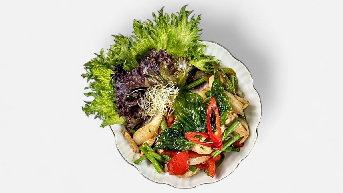 Valgfri protein, bambus, auberginer, lange bønner, sød basilikum og ananas i grøn karrysauce. Serveret med ris.
